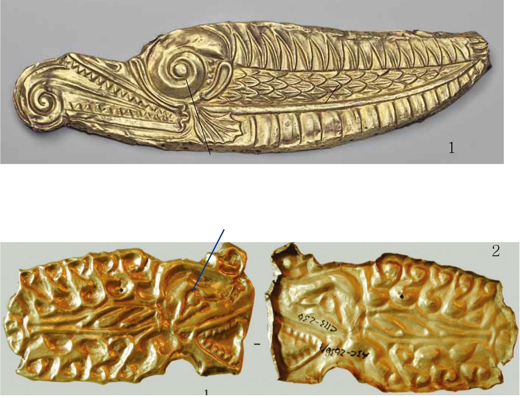 그런데 흑해지역 금제품도 매우 얇은 금박지 정도의 금으로 제작된 것이 기원전 5세기 이후에 발견된다. 가이모노바 유적에서 출토된 말의 볼 가리개 장식(그림 1-2)과 비슷한 형태가 볼샤야 침발카 유적에서 출토된 바 있다. 볼사야 침발카 유적(그림 1-1)은 돌고래 형상이지만 비늘이 새의 깃털과 비슷하게 표현되어서 변형된 돌고래 모양이다. 이 유물과 가이모노바 유적의 유물은 비슷한 형상을 표현하고 있지만 다르게 제작된 것이다. 침발카 유적의 유물은 금판으로 제작되었고 가이모노보바 유적의 유물은 원판은 유기질제(나무, 뼈로 추정)이고 그 위를 금박(10.37g, 9.62g)으로 눌러서 제작한 것이다. 무게를 비교하지 않더라도 침발카 유적의 돌고래 표현은 매우 뚜렷한데 그 이유는 볼록하게 융기된 부분과 들어간 음각 부분이 확연하게 다르기 때문인데, 주물로 제작되었기 때문이다. 돌고래의 눈의 음각 부분을 보면 알 수 있다.