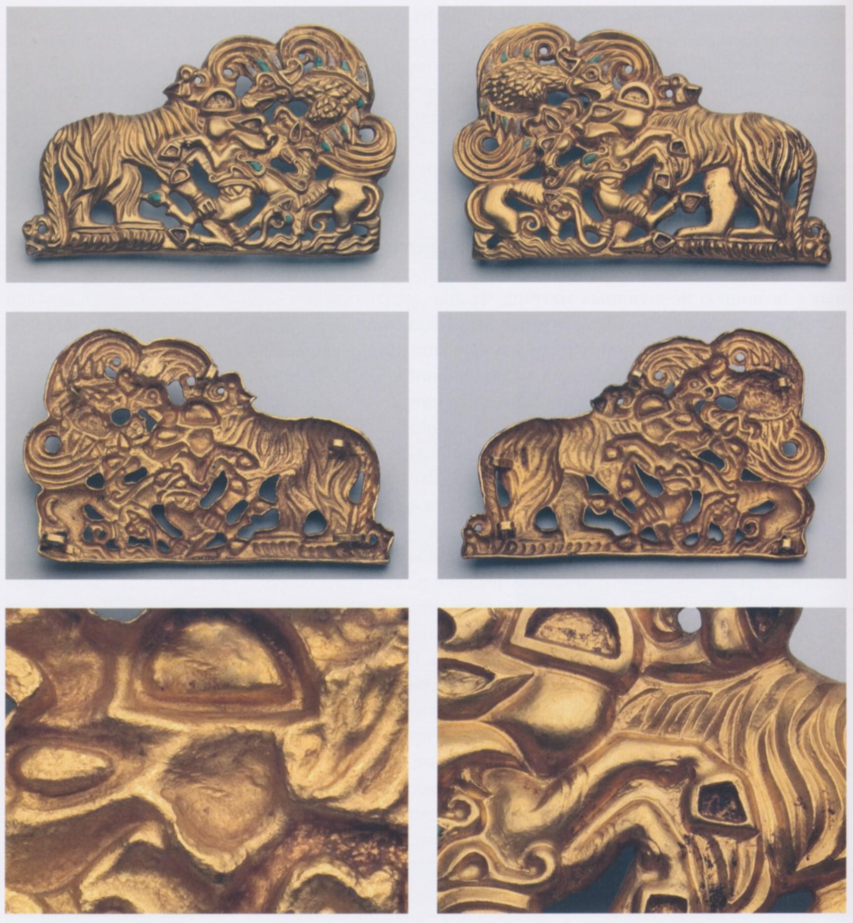 같은 동물투쟁문양 중에서는 뒷면을 무딘 송곳과 같은 도구(체이싱 기법)로 눌러서 앞면을 양각한 유물도 있다(그림2). 이러한 기법은 아무다리야 퇴장유물에서도 확인되는 방법이다.