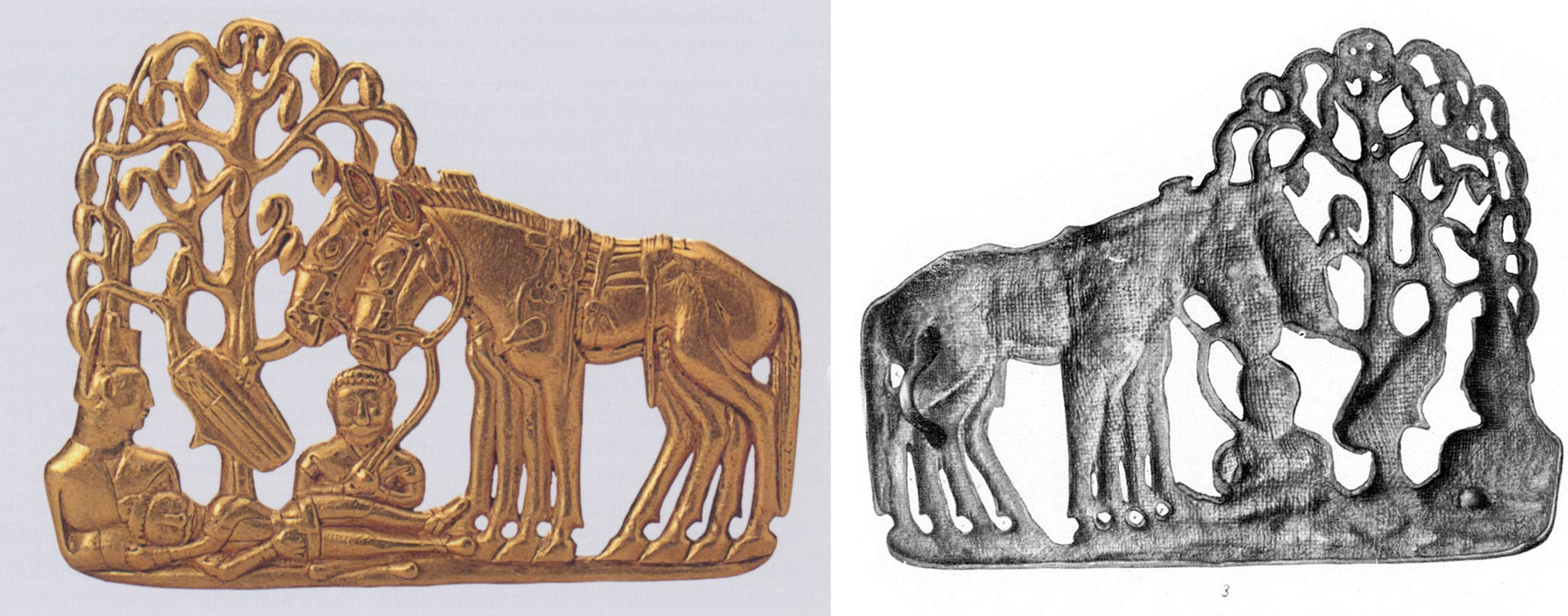 그런데 이러한 기법으로 제작된 유물은 알타이, 흑해지역 뿐만 아니라 표트르 1세의 유물에서도 확인된다(그림 1). 일부 동물투쟁문양에서 발견된다. 이 유물의 뒷면은 기본틀을 만들고 그 위를 눌러서 만들서 생겼다는 것을 알 수 있다.