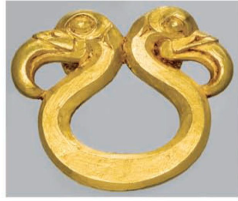 뿐만 아니라 굽동물의 뿔을 주목하고 싶다. 뿔에 달린 가지는 새머리 모양이다. 이 또한 아르잔-2호에서 이미 발견된다. 부리가 과장되게 표현된 맹금은 머리를 맞대고 있는데, 표르트 1세의 유물에서 보이는 뿔의 새 장식과 아주 흡사하다. 아르잔-2호 유물은 5호묘 남성의 고리트 장식이었고, 황금으로 제작된 유물이다.