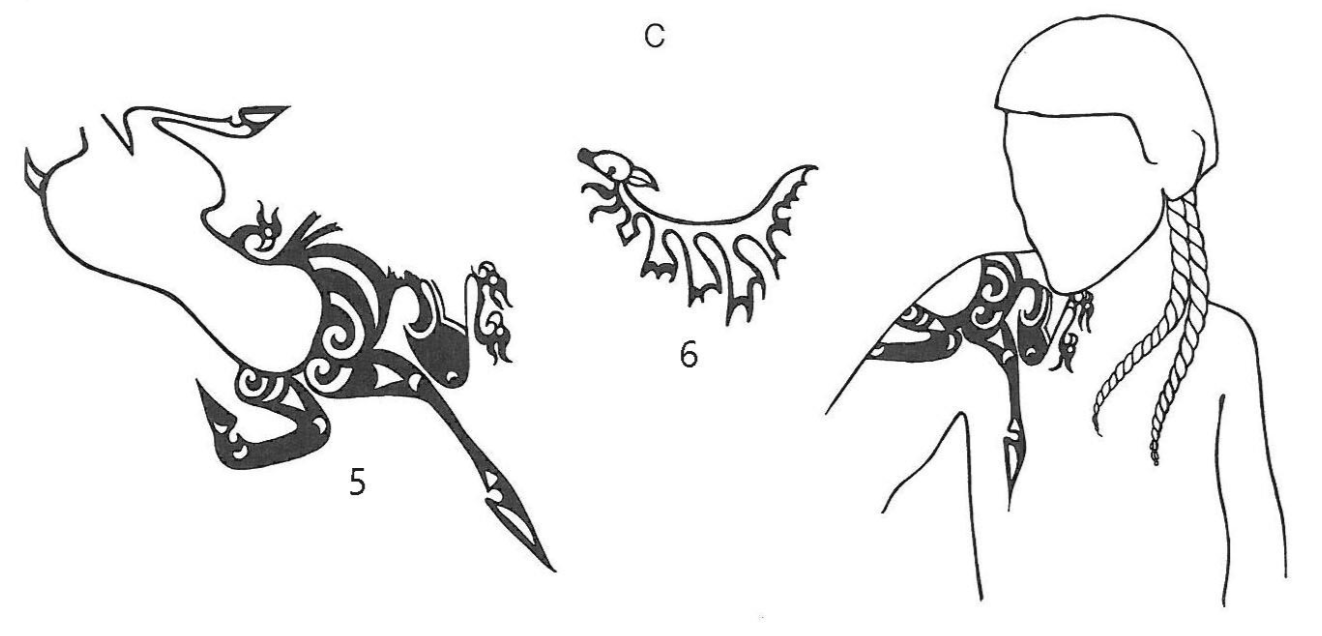 이 그리핀의 날개표현(그림 3)이 문신의 날개 표현과 유사하다. 베르흐 칼쥔 II유적이 기원전 5세기 임을 고려한다면 단순한 호랑이 그리핀(그림 2) 보다 파지리크 유적 안장덮개의 그리핀(그림 3)이 연대로는 더 가까울 것이다.