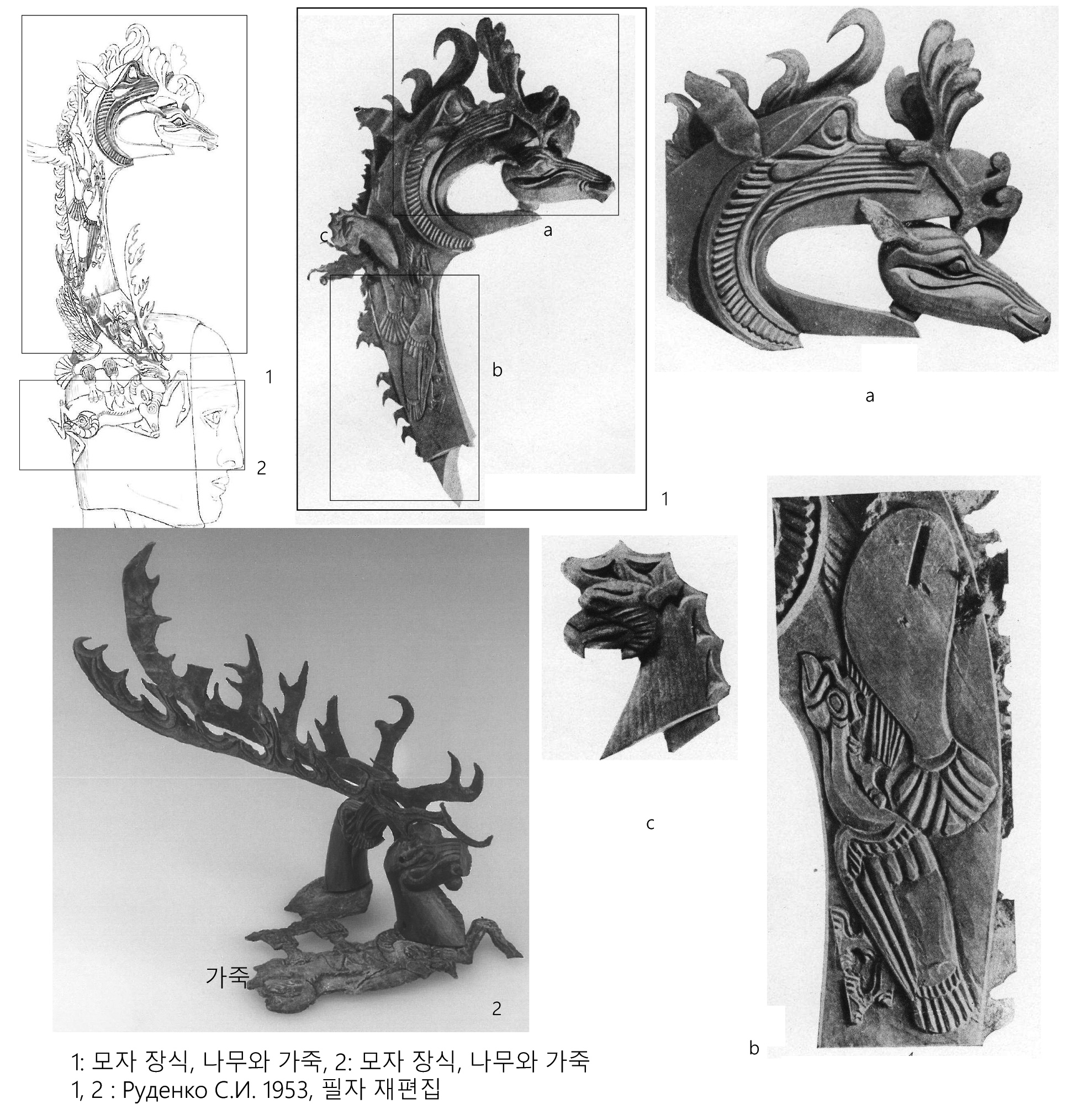 그런데 파지리크 유적 2호 남성모자는 2종류가 있었고 그 중에서 요란한 장식이 붙은 모자(그림 1)는 매우 유니크 한 것이다. ‘ㄱ’ 자로 꺽어지는 맹금의 목에는 새 문양이 조각되어 있고 맹금은 입에 사슴머리를 물고 있는 있는 모습이다. 펠트로 만들어진 모자에 부착해서 장식되었다고 추정한다.