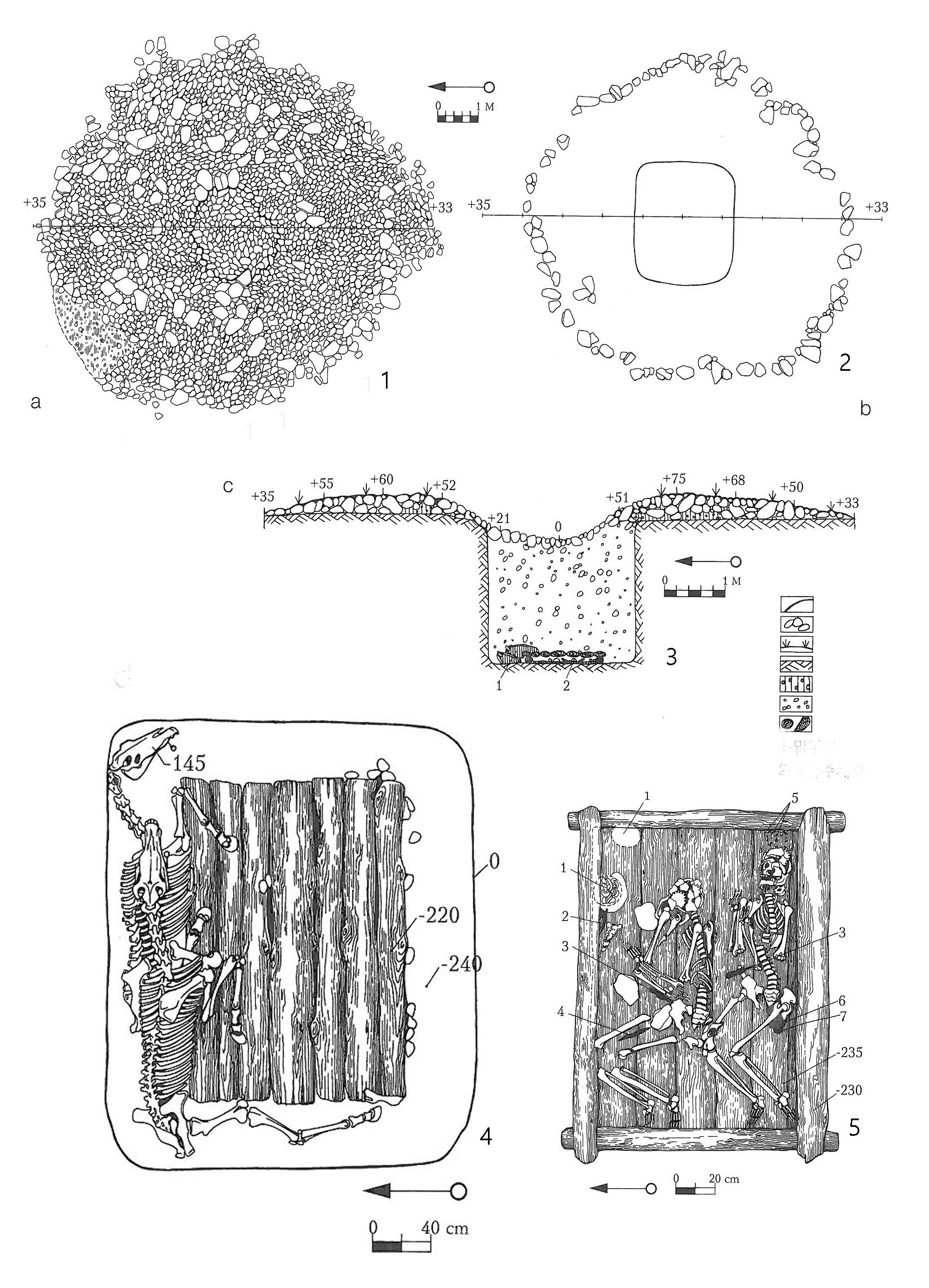 아크 알라하 5유적의 4호에서는 이 유적의 5기 무덤 가운데 유일하게 남녀가 합장된 무덤이다. 직경이 8.7m가량으로 무덤구덩이의 크기는 3.05×2.5m, 깊이 2.4m 정도이고, 중심부에 장방형으로 파진 것이다. 도굴되지 않은 무덤이고, 깊이 1.45m에서 북쪽에 배장된 말의 무덤이 드러났다. 2마리가 부장되었는데 포개지게 누워 있었고 머리는 동쪽을 향했다.