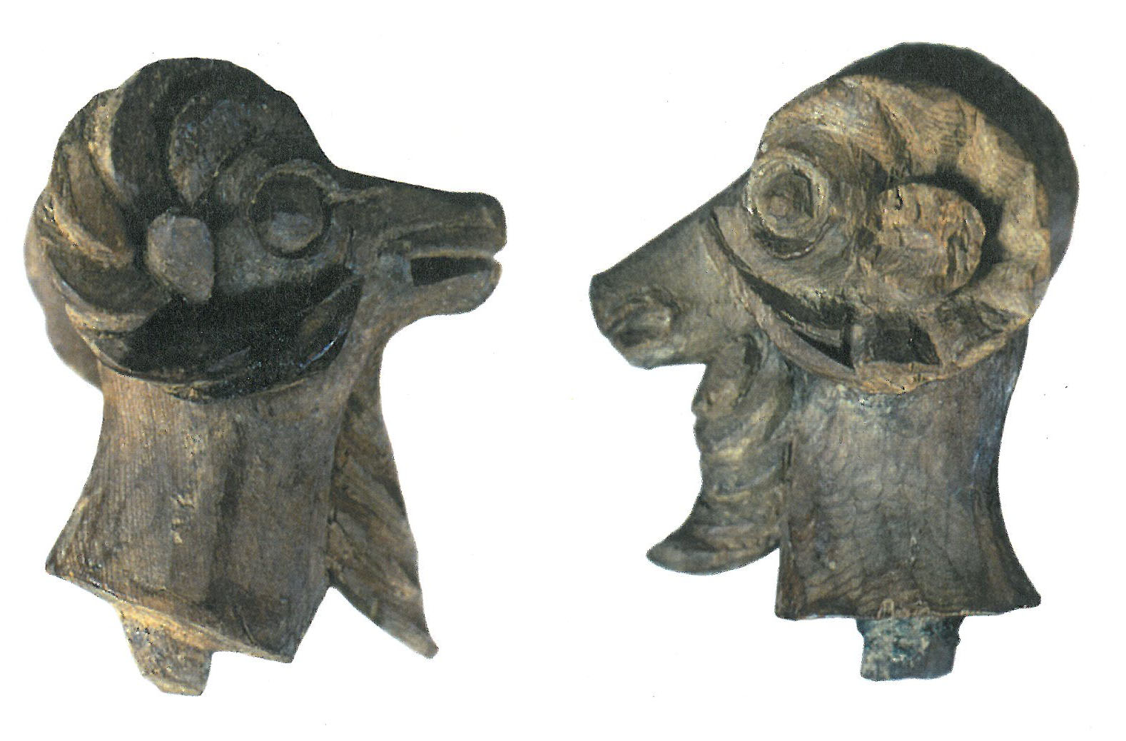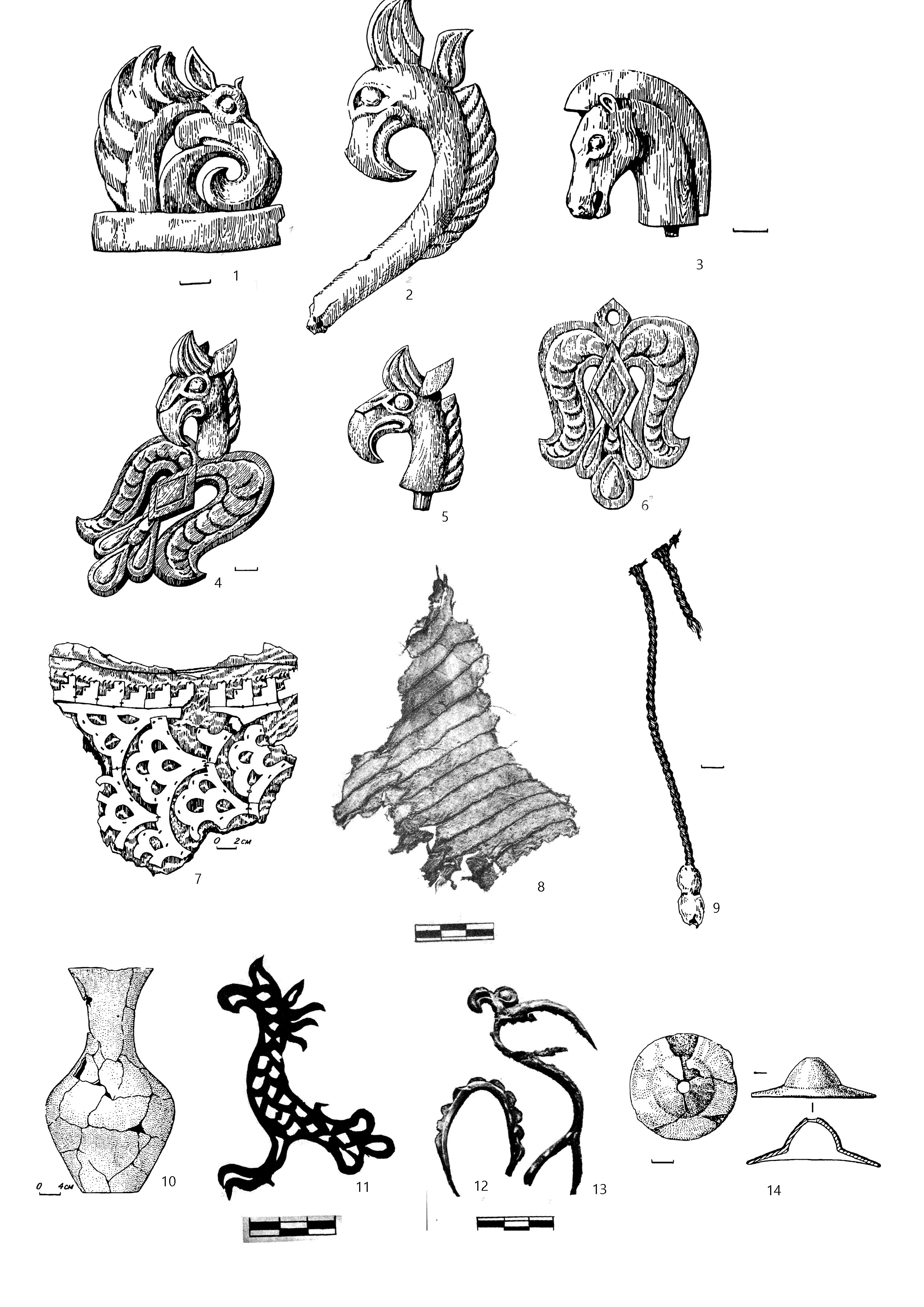 마구의 굴레장식은 아크 알라하 3 유적, 아크 알라하 1유적과 기본적으로 비슷하다(그림2-1~6). 그런데 눈에 띄는 유물은 말의 머리를 조각한 것이다(그림 2-3). 금박을 입힌 채 남아 있었는데, 모두 4점이 발견되었다.
