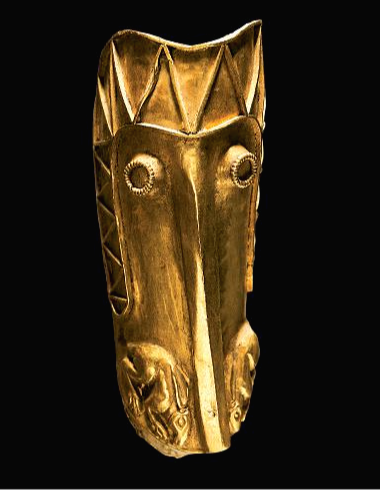 뿐만 아니라 말머리 모양 장식판도 나왔는데, 길이가 10cm가량으로 실제로 말머리를 장식했는지는 의문이다. 장식판의 눈부분에는 감입부가 있어서 그 안에 다른 색의 돌을 끼워 넣었을 수 있다. 콧 구멍자리에 토끼 2마리가 표현되었다.