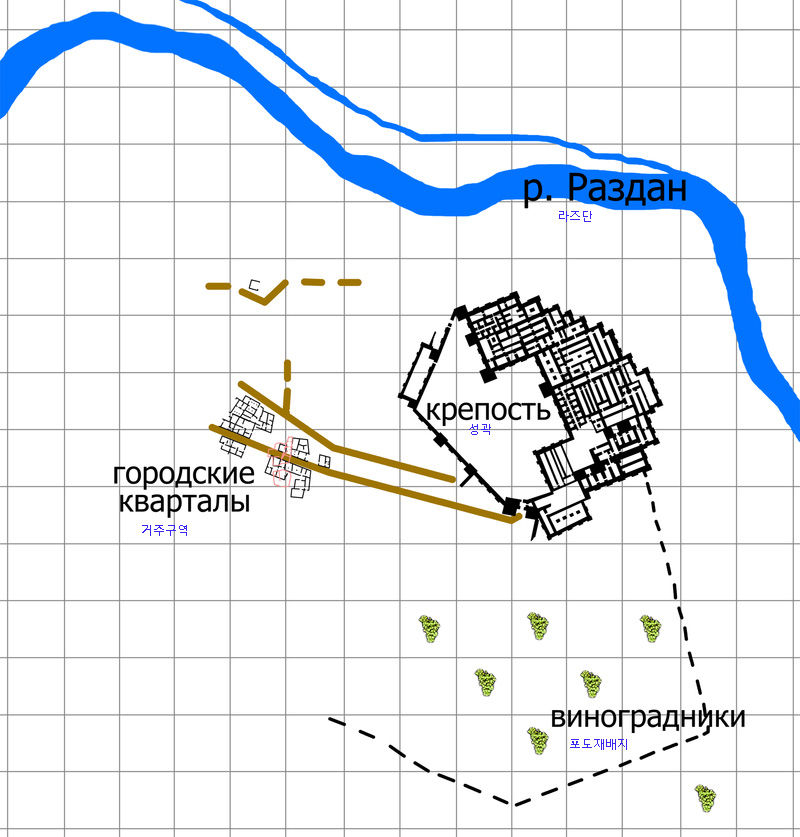 그림 1. 테이시바이니 성곽의 평면도, 그리드는 50m간격