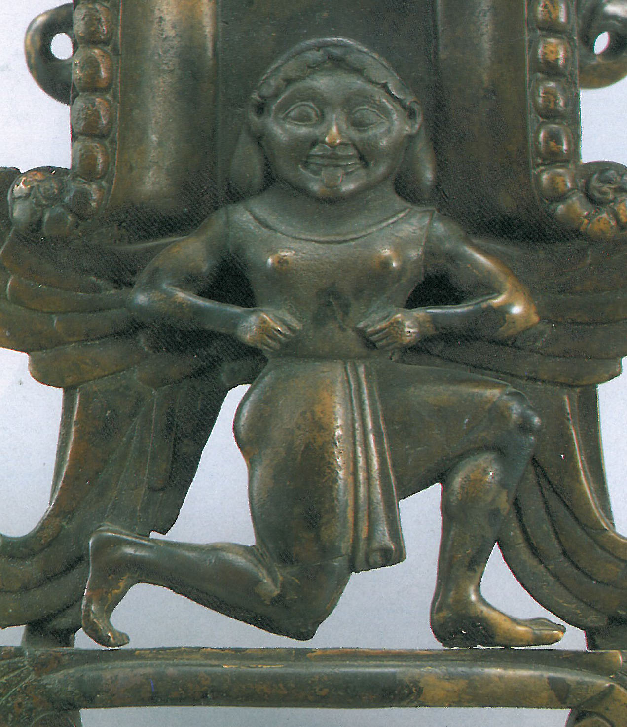 그런데 자세히 보면 이 여성은 혀(그림 1)를 내밀고 있다. 혀를 내밀고 있는 여성은 그리스의 메두사고르곤이라고 여겨진다. 청동용기의 손잡이에 표현된 여성은 매우 얇은 옷을 입고 있는데 그리스 사람들이 입고 있는 것이다.