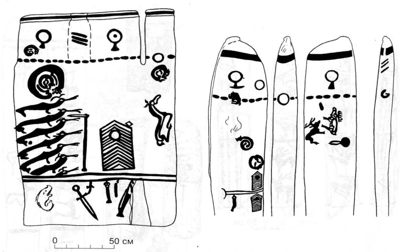 기억하시겠지만, 아르잔-1호의 무덤 바닥에서도 사슴돌이 발견된 바 있다(그림 2). 이 사슴돌은 상단과 하단이 깨어진 것이다. 남아 있는 부분의 위에 무기가 그려진 것인데, 깨어지지 않은 사슴돌에는 주로 하단에 무기가 그려진 것을 감안하면 남은 부분은 원래 사슴돌의 하단일 것이다. 이 사슴돌에는 무기 아래에 멧돼지와 사슴이 그려졌다. 특히 사슴은 등에 뿔이 있으며 다리를 곧 세우고 있어서 청동기시대 사슴돌에 그려진 사슴과는 차이가 있다.