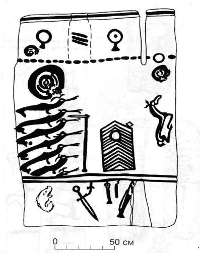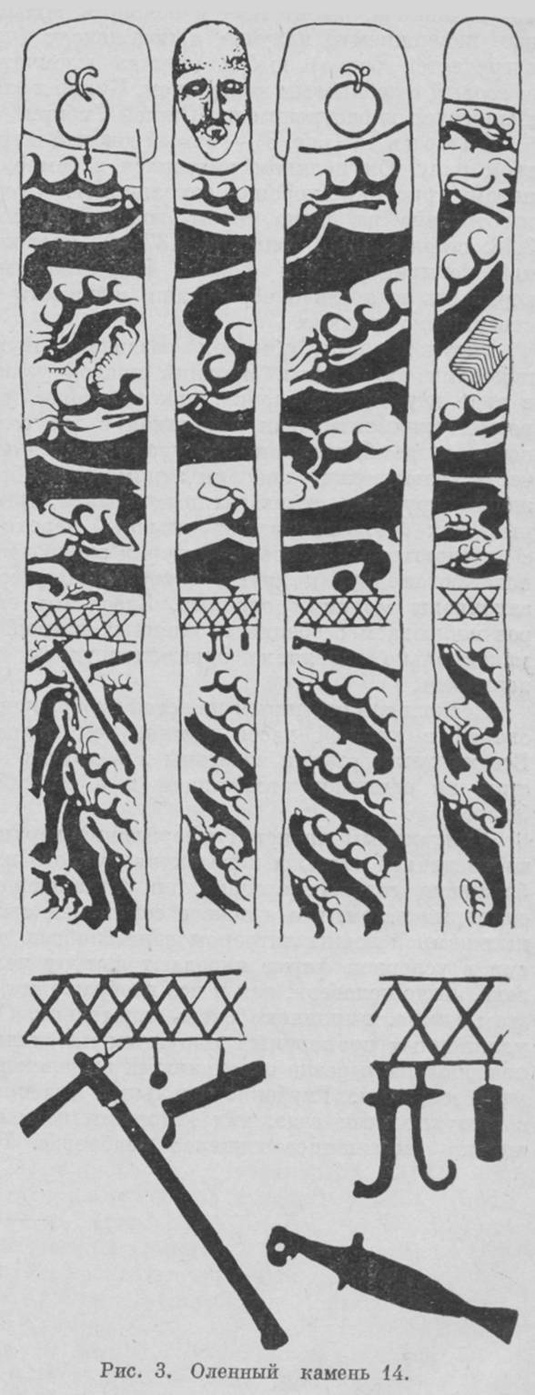 그런데 특이하게도 투바와 몽골 등 사슴돌에서도 원형 맹수장식이 발견된다. 투바에서는 코시-페이 산과 우육 강 주변에서도 확인되었는데, 원형 맹수장식이 있는 것이다.