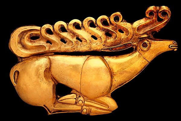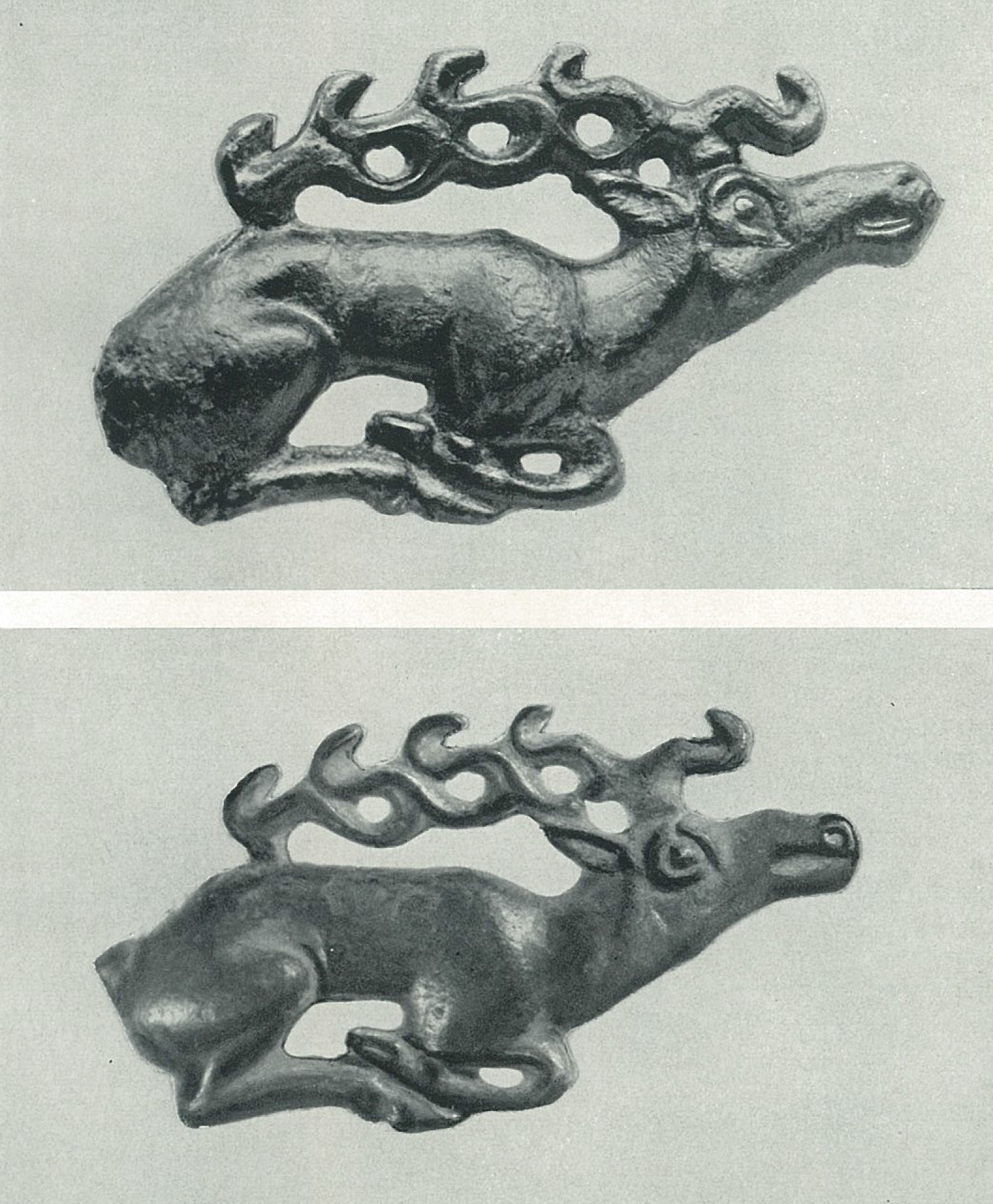 시베리아에서는 전통적인(청동기시대부터 전해진) 사슴장식은 표현방법이 매우 다양하며 암각화와 사슴돌이라고 불리는 입석에서도 볼 수 있다. 하지만 몸통길이 만큼 길게 표현된 뿔을 달고 있는 사슴이 다리를 접어 넣어서 표현한 것은 흑해지역에서 먼저 표현되기 시작해서 동부지역까지 퍼졌다고 볼 수 있다. 흑해지역에서 이러한 사슴문양이 발견된 것은 기원전 7세기경이며, 같은 시기에 아르잔-2호에서 볼 수 있는 사슴문양은 다리를 세우고 등에 혹이 있는 문양이다.