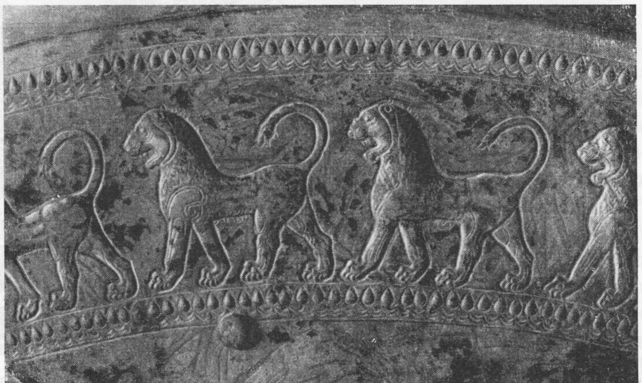 이와 같은 사자가 페르시아에는 기원전 5세기경에 지어진 페르세폴리스 궁전벽에 남아 있다. 그런데 이 보다 더 이른 시기인 기원전 8세기경의 우라르투 유적인 카미르-블루르 유적에서 출토되었다. 뒷다리에는 보이지 않지만 앞다리에는 기호와 유사하며 비슷한 포즈로 걷고 있다.
