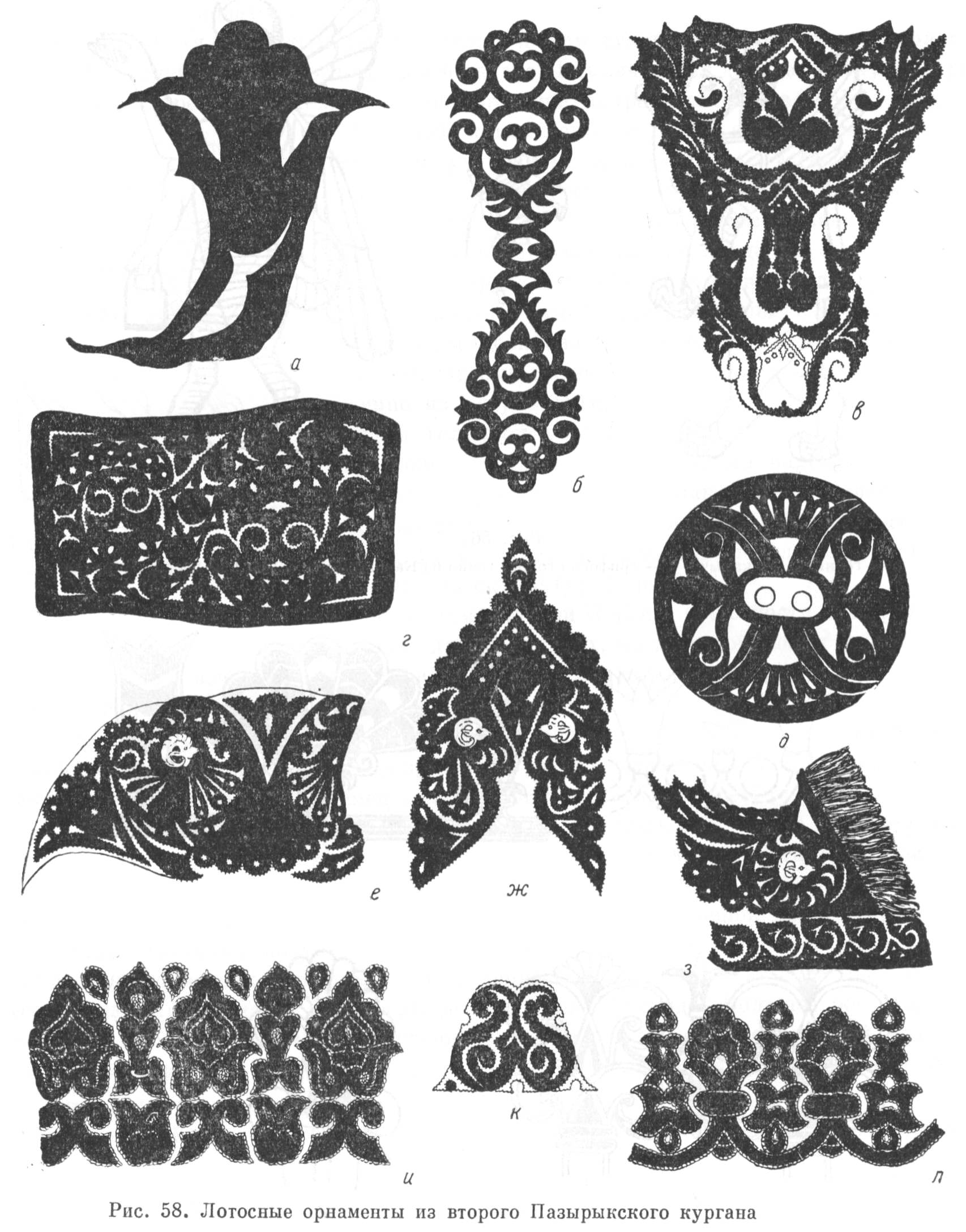 파지리크 유적 2호에서는 연꽃 문양(그림 1)이 확인된다. 대부분 펠트 소재로 정교하게 재단된 것으로 양모로 된 제품(의복, 안장덮개)등에 붙여서 사용되었다. 특히 2호에서 많이 발견되었다. 루덴코는 이 문양도 아케메니드 왕조에서 전해진 것이라고 생각했다. 물론 알타이에서 고쳐서 사용한 것으로 보았다.