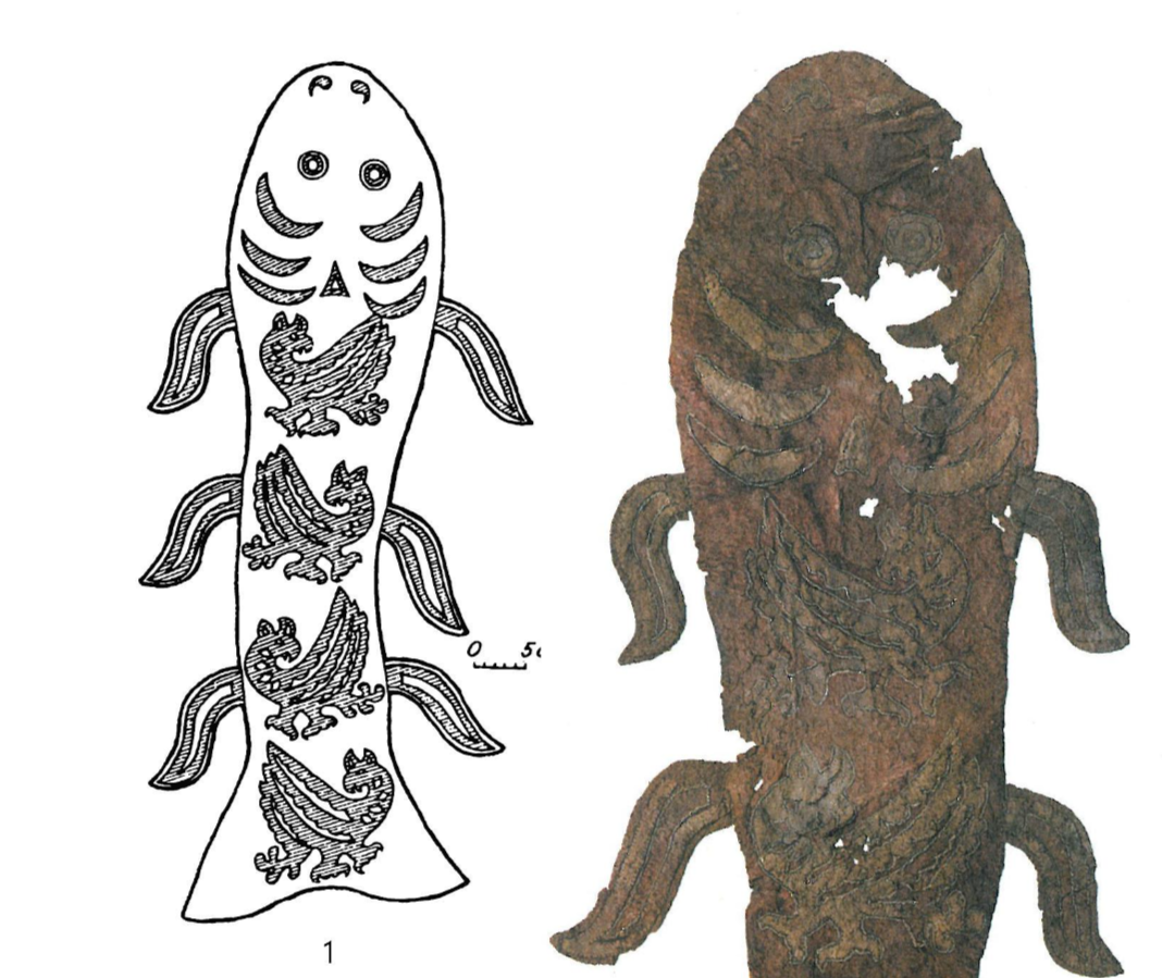 바샤다르 유적 2호에서 발견된 안장에 달았던 장식이다. 뭔가 모르겠는 문양이다. 단지 몸통이 긴 두 마리 동물이 S자형을 이루고 있다.