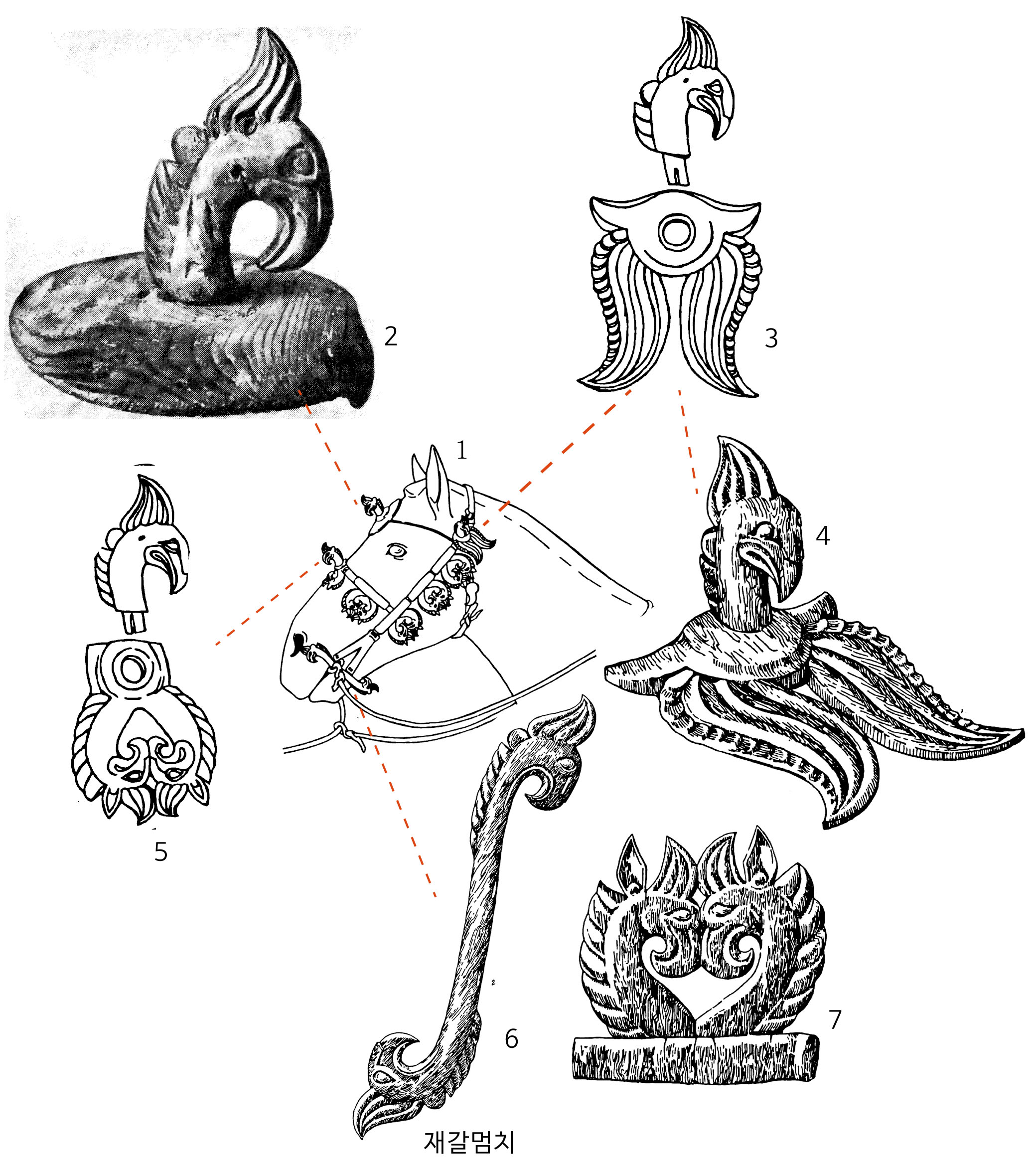 보여드린 펠트제 그리핀은 이 유적의 남성전사 말을 장식했던 굴레장식(그림 5)으로도 사용되었다.