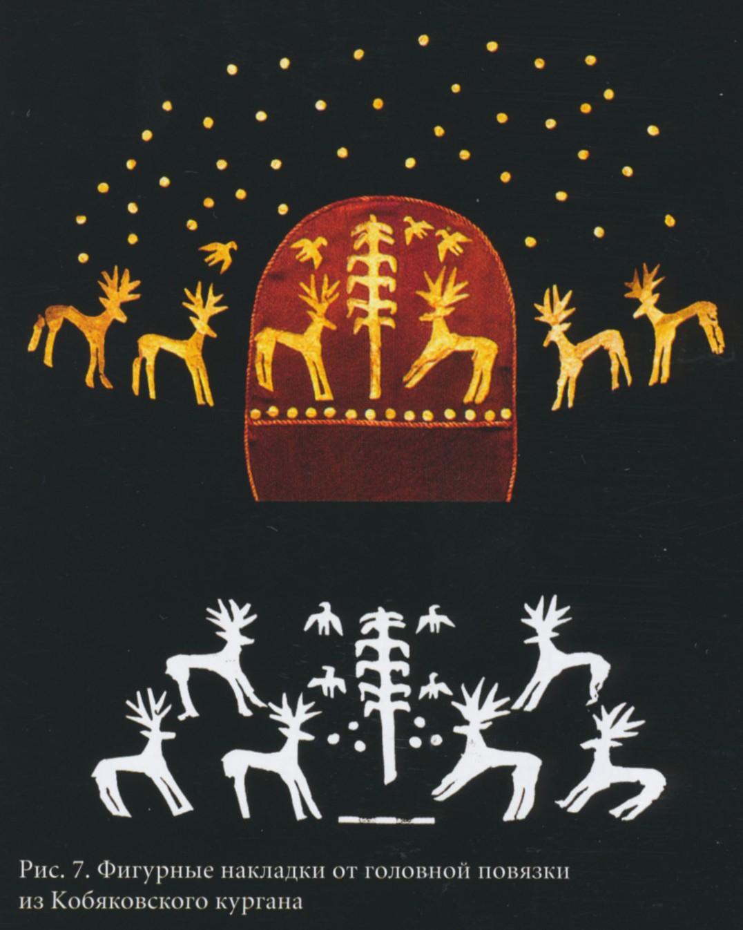 호흘라치 유적과 가까운 로스토프 시 부근의 코비아코프스키(Кобяковский, Kobyakovsky) 유적에서는 무덤 10호에서 가죽으로 된 머리띠 장식이 발견되었다(그림 1). 거기에는 금판을 오려서 만든 아플리케 장식이 붙어 있었다. 가죽 머리띠 장식은 모자에 달았던 것으로 추정된다. 발굴당시에는 모자는 남아 있지 않았고 금판과 가죽띠만 남은 상태였다. 두개골의 머리위에서 발견되었다. 세계수를 중심으로 수사슴이 양쪽으로 6마리가 배치되었고 사슴과 나무 사이에는 양쪽에 2마리씩 날개를 편 맹금이 표현된 것이다.