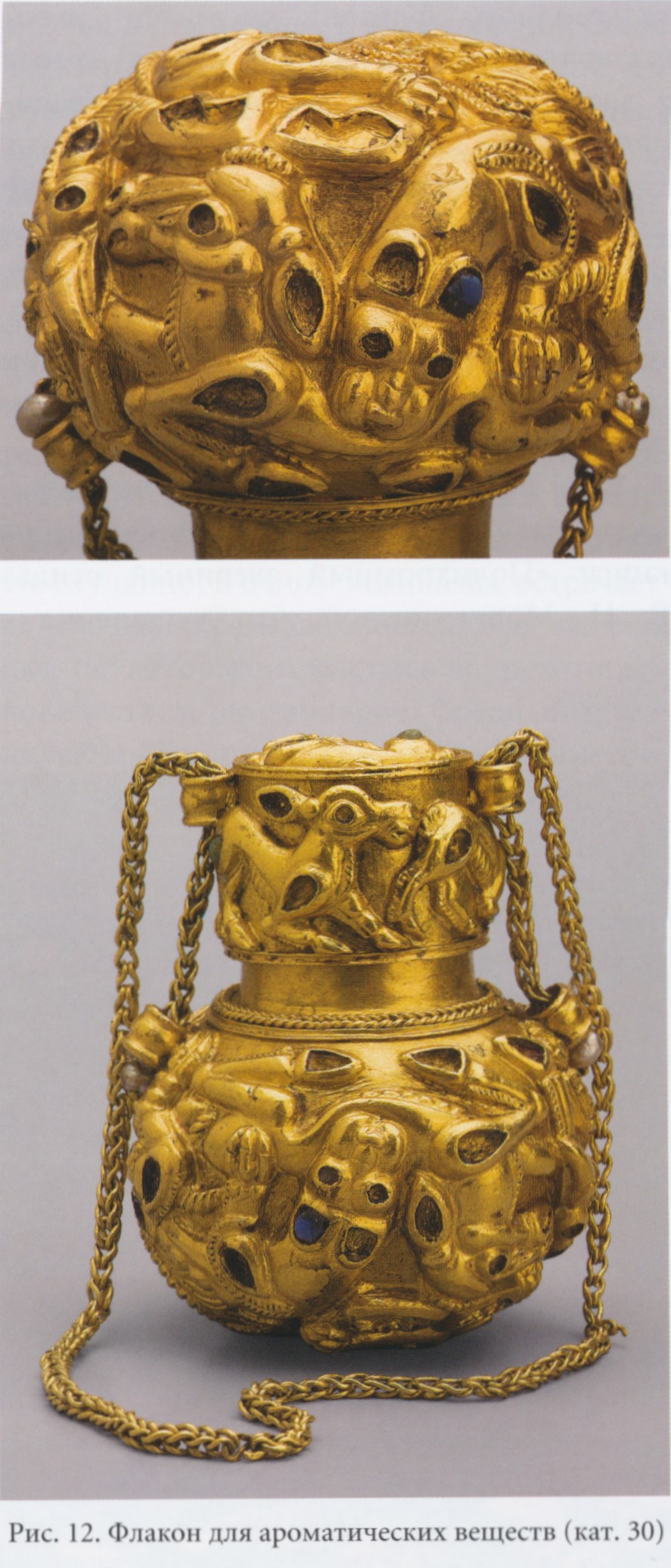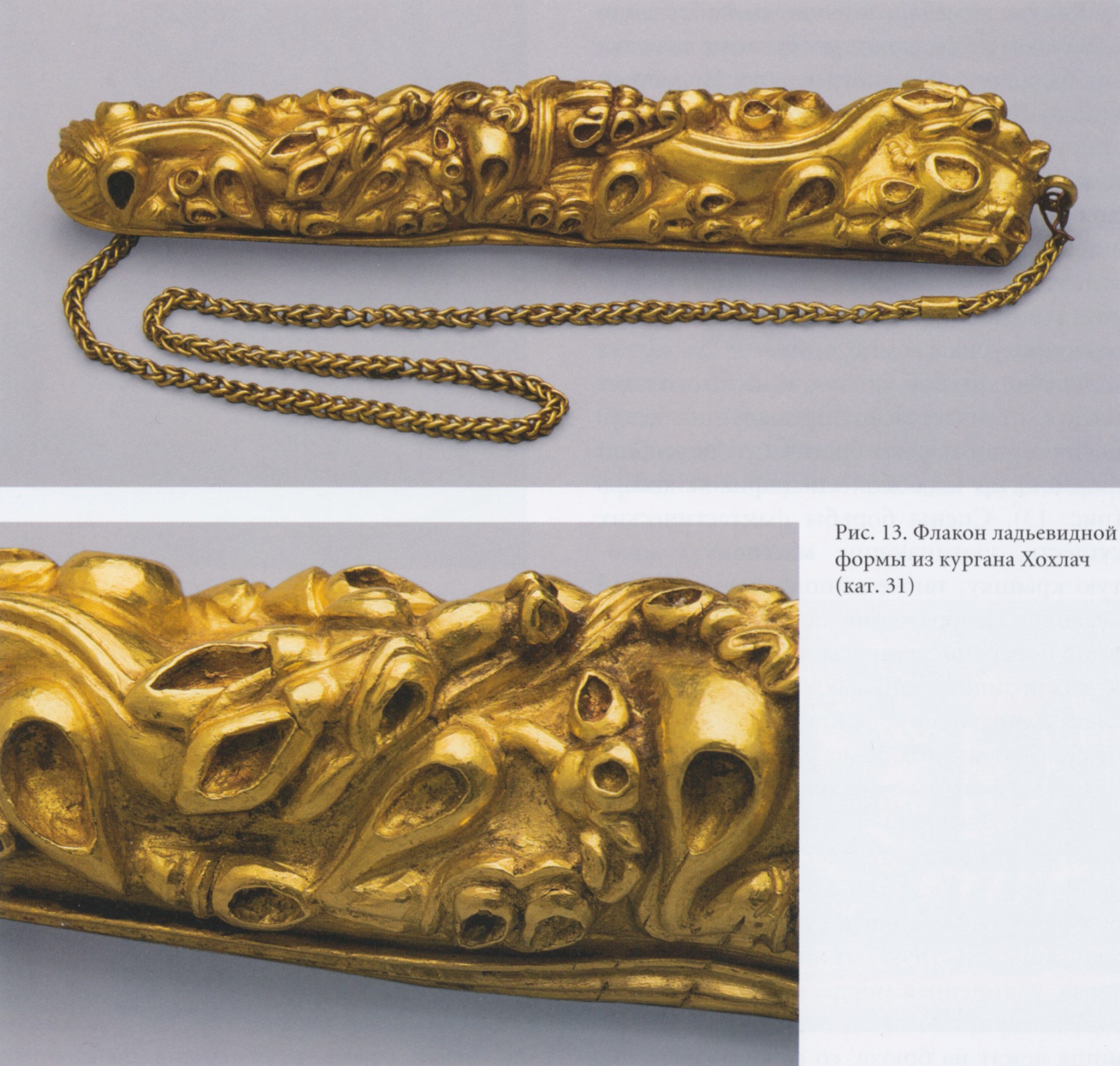 보트 모양으로 만들어진 향수병에도 역시 동물투쟁문양이 표현되어 있다. 늑대 얼굴을 하고 몸통이 긴 동물이 뿔달린 동물을 공격하는 장면이다. 늑대 얼굴을 한 몸통이 긴 뿔달린 동물은 스키타이 문화의 그리핀과는 차이가 있다. 늑대얼굴을 한 변형 동물들은 있었지만 몸통이 길다랗게 표현되지는 않았다.