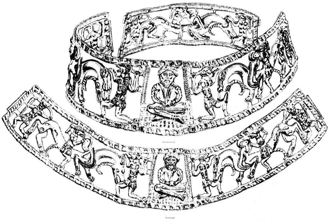 이 여성은 매우 화려한 목걸이(그림 2)를 착용하고 있었다. 잠금장치가 있는 것으로 남성이 중심에 있고 양쪽에는 말의 머리를 하고 있는 용을 타고 있는 기마병이 창을 들고 있는 남성, 궁수가 싸우는 장면이 표현되었다. 중심에 있는 남성은 수염을 길렀고 중앙아시아 사람들의 의복인 카프탄을 입고 있었다. 여밈이 있는 있는 상의이다. 남성은 앉아서 다리를 교차해서 앉아 있는데, 무릎에는 검이 들어 있는 검집이 놓여 있었고, 손에는 잔을 쥐고 있었다.