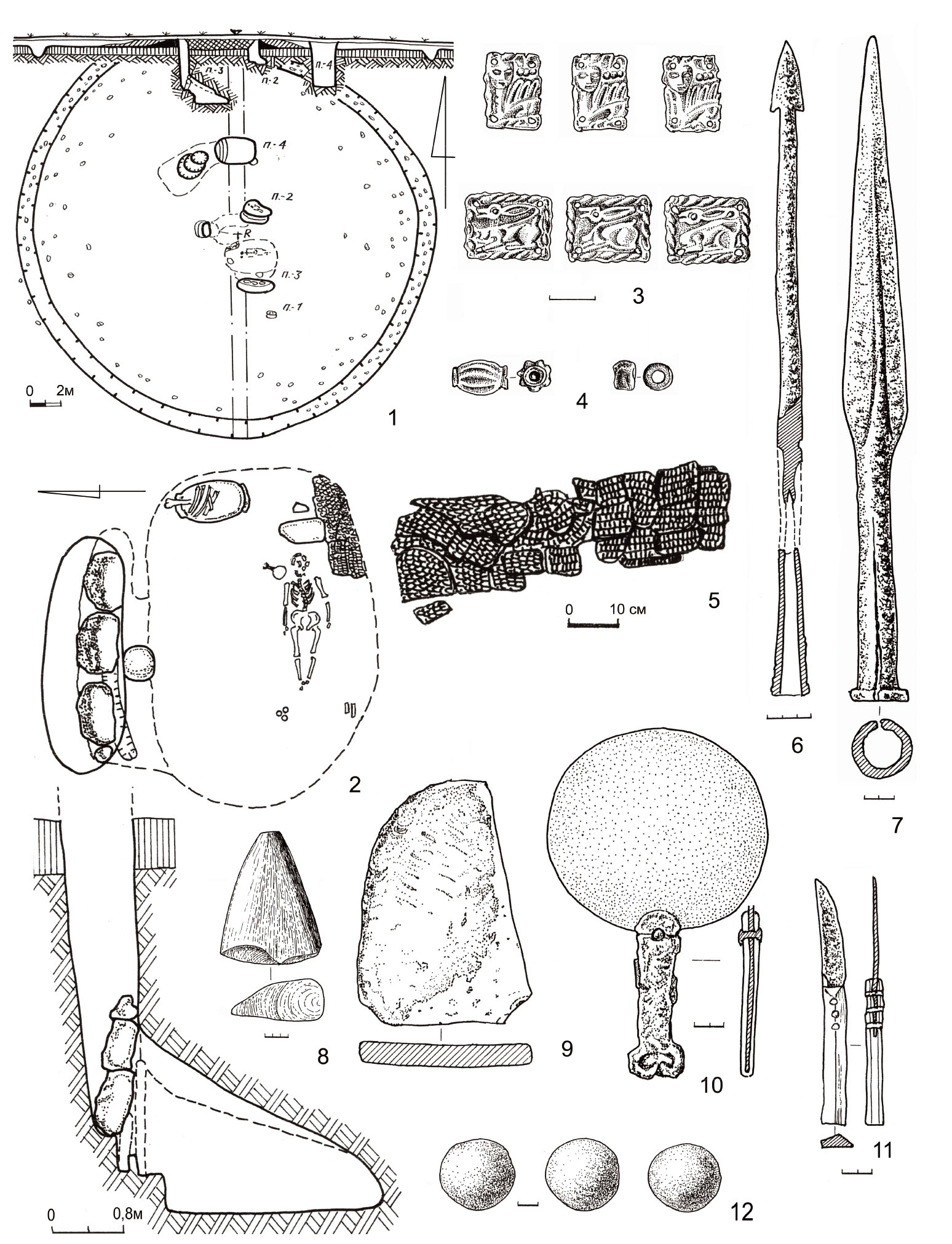 그런데 질료니예 2유적 5호 쿠르간 내부에는 3개의 무덤이 발견되었고 모두 여성들이었다. 매장방법은 2호 쿠르간과 같았다. 그런데 그 중에 2호묘의 여성은 철제갑옷, 창, 유리구슬, 칼, 거울 등이 함께 매장되었다(그림 4). 나머지 2개의 무덤은 주인공 여성보다는 지위가 낮은 여성으로 추정된다. 특히 이들은 십대의 여성이다.
