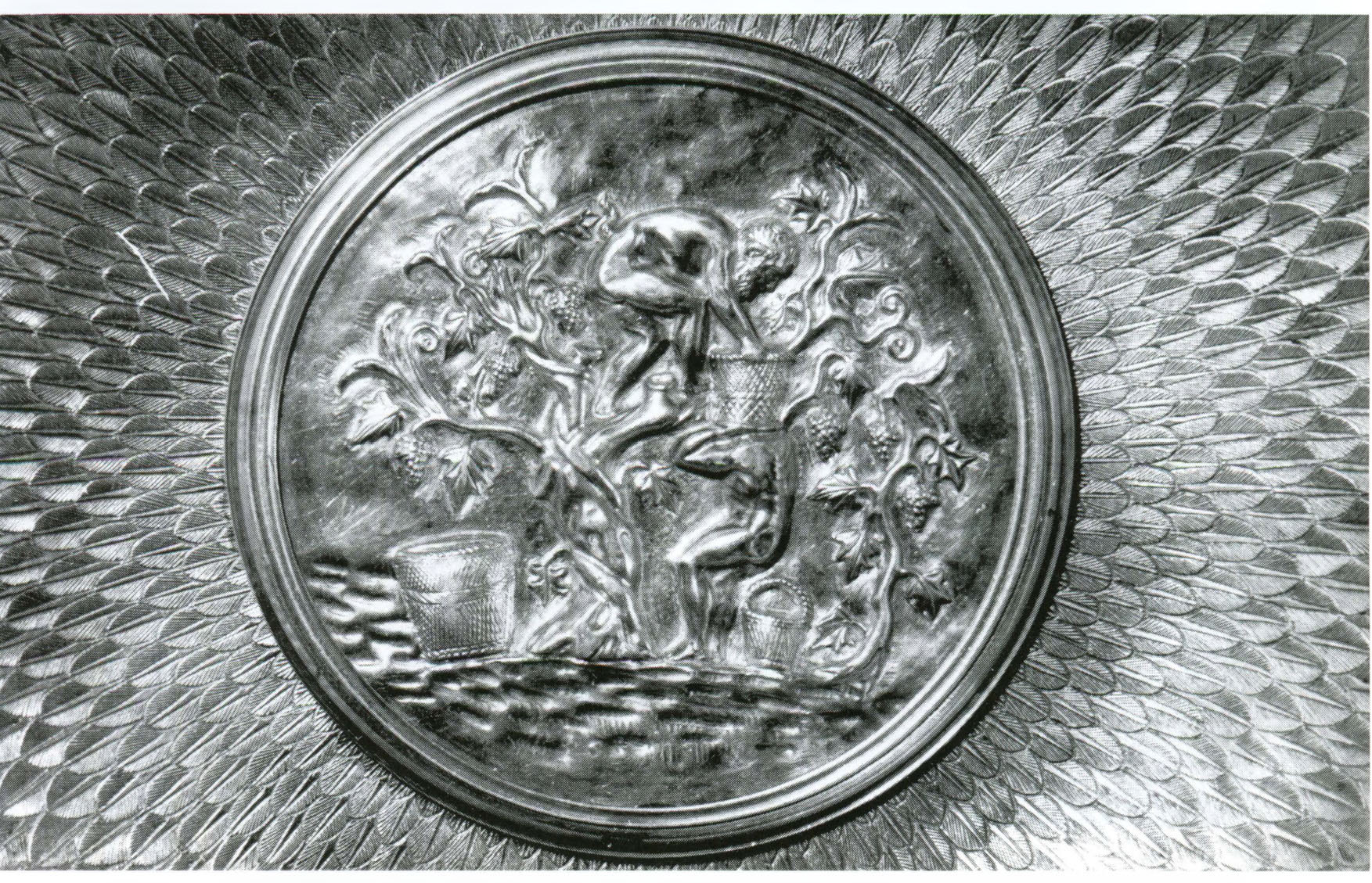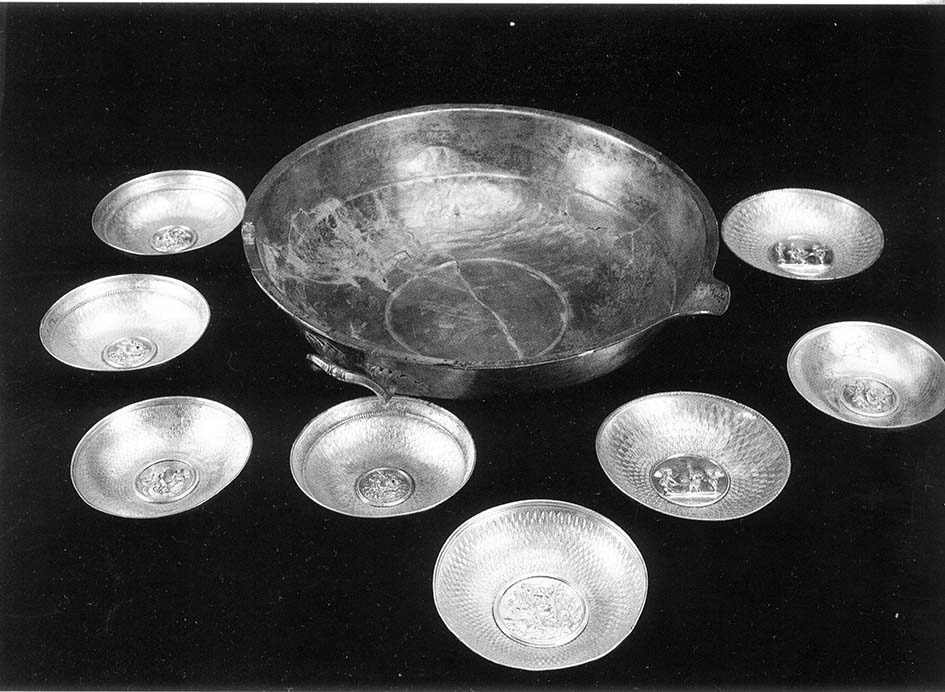 은제 쟁반은 모두 8점(그림2)으로 바닥 중앙에는 큐피드와 프시케의 신화(그림 3)와 관련된 형상이 주조된 것이었다. 신화와 관련된 유물 가운데는 포도원에서 포도를 수확하는 장면도 남아 있다(그림 4). 그런데 이 유적의 이름은 ‘사드브이(정원 주로 과수가 있는 정원을 의미)’이고, 유적이 발견될 당시에 포도재배연구소의 연구부지 내에서 발견되어서 상당히 상징적이다. 금도금한 청동쟁반(그림 2)은 뒤집어졌고 그 아래에서 은제 쟁반 8점이 발견되었다.