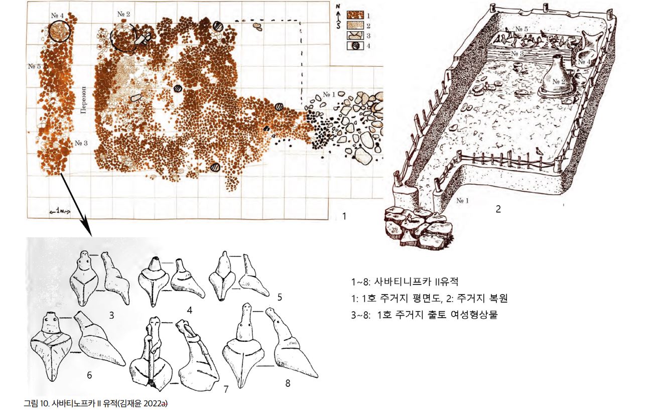 후기구석기시대 유적 이후로 흑해 부근을 비롯한 동유럽에서는 순동시대인 쿠쿠테니-트리폴리예 문화에서 인간형상물이 집 속에서 발견된다. 사바티노프카(Саватиновка,Savatinovka) II유적은 취락 유적으로 1호 주거지(그림 10-1,2)는 의례 공간으로 추정되는 공간에서 인간형상물 32점이 발견되었다. 모두 여성형상으로 의자에 앉아 있는 형태이다. 여성의 둔부가 강조되었고 온몸에 삼각형 문양이 장식되었다. 1점을 제외하고는 팔이 없으며, 얼굴 표현도 일반적인 인간의 눈, 코, 입과는 다르다. 팔이 있는 여성상 1점은 뱀을 앉고 있다(부르도 2018, 그림 10-3~8).
