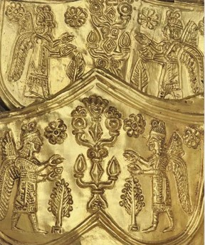 은제거울에는 금판에 문양을 새겨서 접합했고, 철제검은 손잡이와 검집은 금으로 입히고 화려한 동물문양으로 장식되어 있다. 특히 철제검의 손잡이와 검집 문양은 두 사람이 나무를 마주보고 있는 장면이 나온다. 이 문양은 코카서스 남쪽의 고대 우라르투 왕(사르두우리 ii, 아르기쉬치 I)의 투구에 나온다. 또 반인반수도 고대 우라르투 왕의 의자를 장식하던 문양과 같다. 토프라흐-칼레 유적에서 출토된 유물이 에르미타주 박물관에 전시된 바 있다.