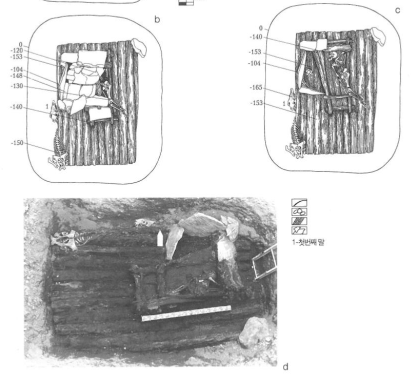 무덤구덩이를 채운 돌을 드러내자 바닥에서 깊이 1m 가량에서 무덤구덩이의 동쪽에서 말 3필이 확인되기 시작했다. 말 2마리는 두향이 동쪽이었고, 완전히 옆으로 뉘웠으며, 말 한 마리는 이 말의 다리 부위에서 확인되었다. 이 말은 배를 바닥에 깔고 확인되었다(그림 5) 3필을 드러내자 그 아래에는 작은 무덤이 하나 있었다(그림 6). 이 무덤은 뭘까? 여성샤먼은 그 보다 아래에 있다.