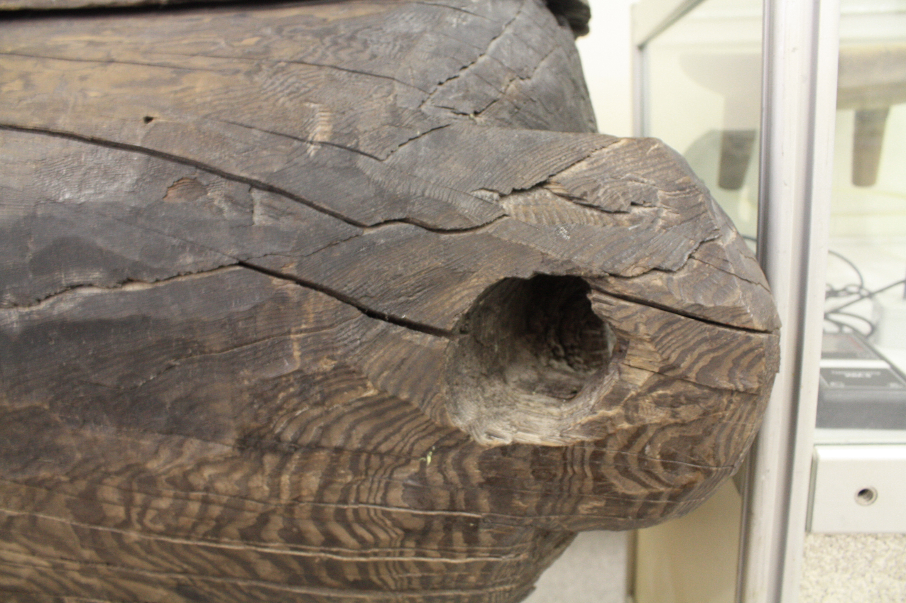 얼음이 녹자 통나무관의 뚜껑이 드러났다. 통나무관(그림 245)은 통나무 안을 파서 만든 것이다. 끝에 귀때기가 붙은 것이다(그림 2~54). 이 부분은 못을 밖기 위한 것인데, 이 유적에서는 청동 못 2개가 밖혀 있었다. 다른 유적에는 나무정이 밖히기도 한다. 길이가 2.73m, 내부의 깊이는 0.3m, 밖에서 본 높이는 0.68m이다.