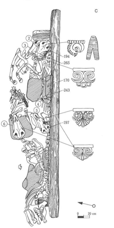 다섯 번째 말은 깊이 1.97m에 벽과 아주 밀착되었다. 전체 재갈 부속과 장식들이 잘 보존되었다.