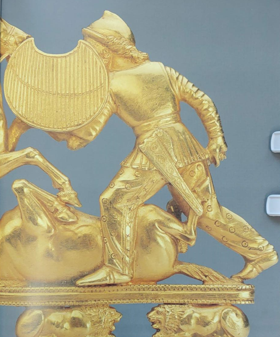 그림 6. 솔로하 유적 출토, 에르미타주 소장, 황금 빗의 일부, 말에서 떨어진 그리스 전사의 얼굴과 갑옷