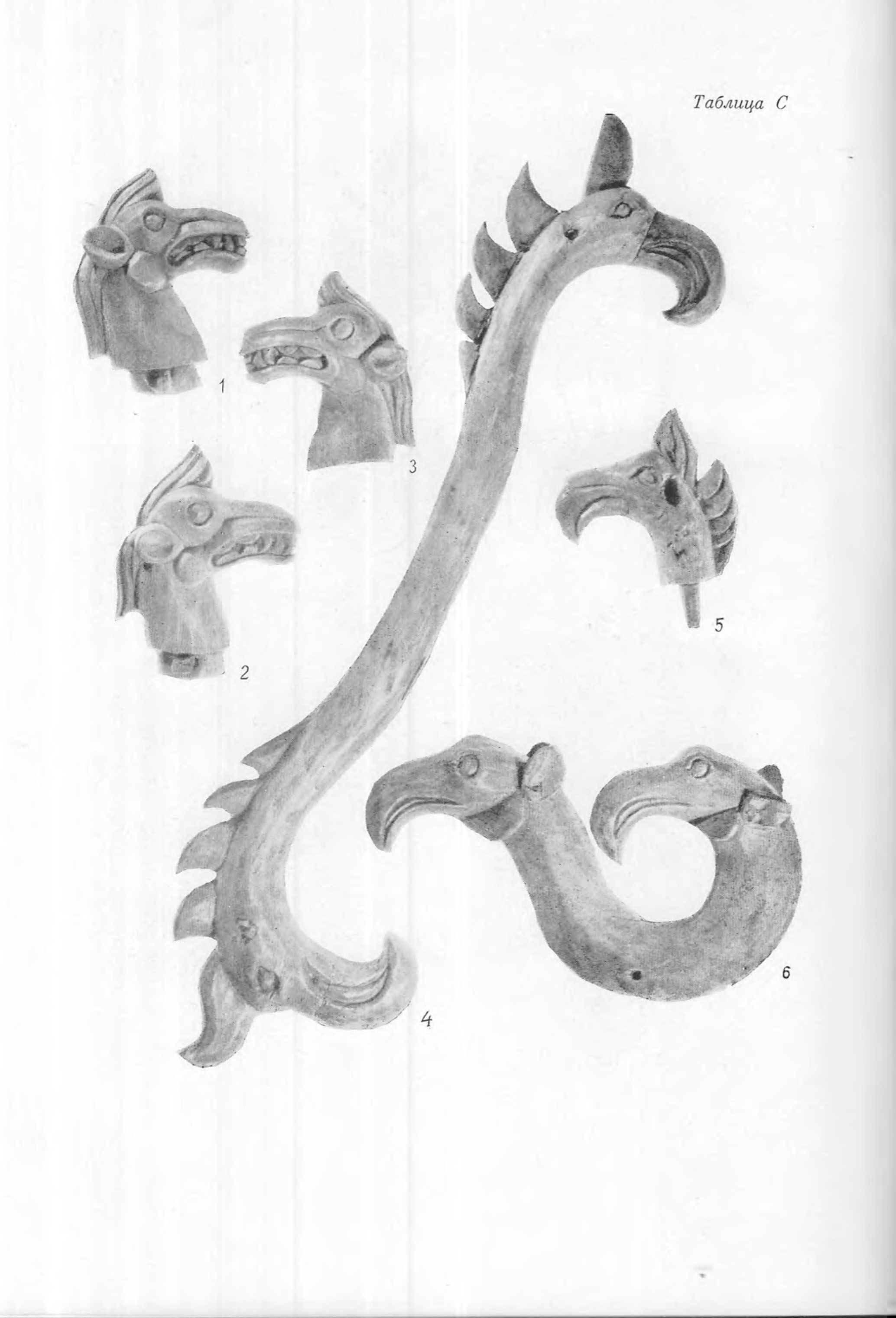 아크 알라하 1 유적에서 출토된 말을 장식하던 그리핀(그림 1,2)은 특징이 독수리 부리모양의 부리, 머리 정수리를 장식하는 상투, 목을 따라서 표현된 갈기이다.