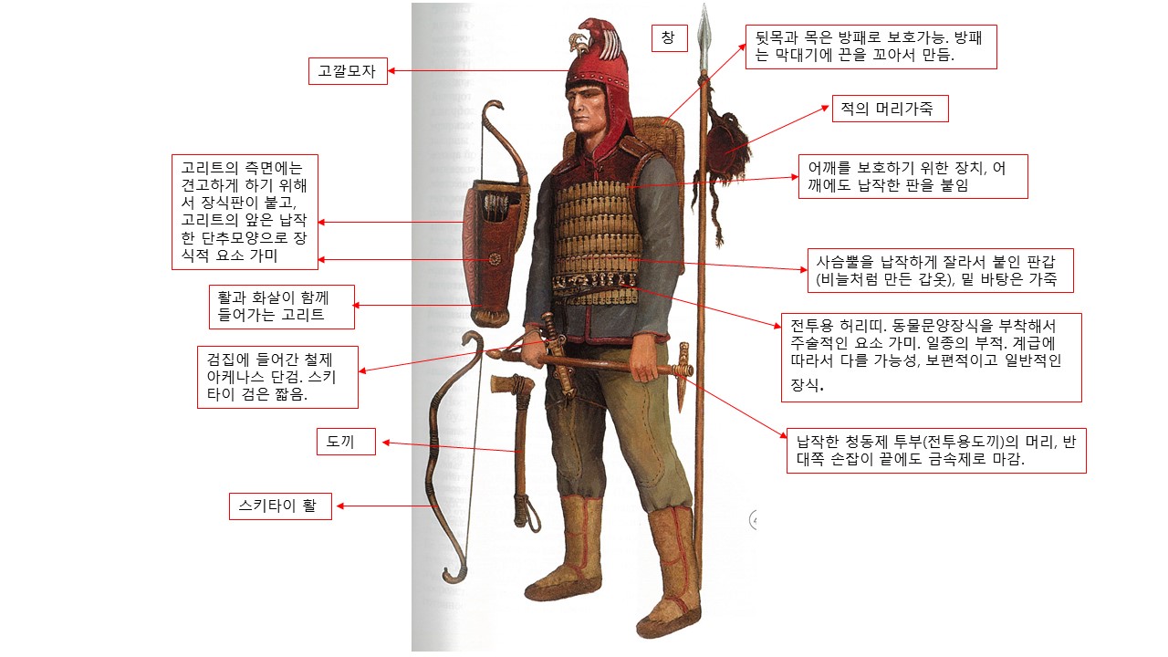 솔로비요프가 복원한 스키타이 전사에 대한 설명이 부족해서 아래 그림에 다 표기했다.