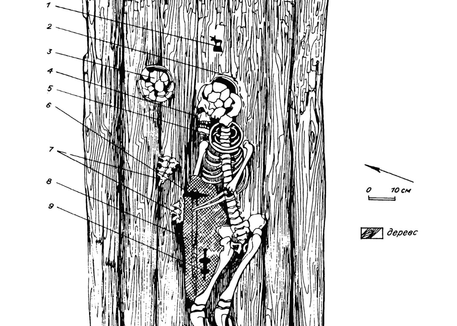 우선 앞의 아크 알라하 3유적의 1호분(일명 얼음공주), 아크 알라하 1유적의 1호분(남성 2인)무덤에서는 나무로 짠 무덤방에 시신을 바로 안치하지 않고, 그 안에 관을 따로 두었다. 관은 큰 통나무를 파서 만든 통나무관이다. 그런데 아크 알라하 1유적의 1호분 소년의 무덤에는 무덤방에 바로 소년이 안치되었다. 이 무덤에는 통나무관은 없었다.