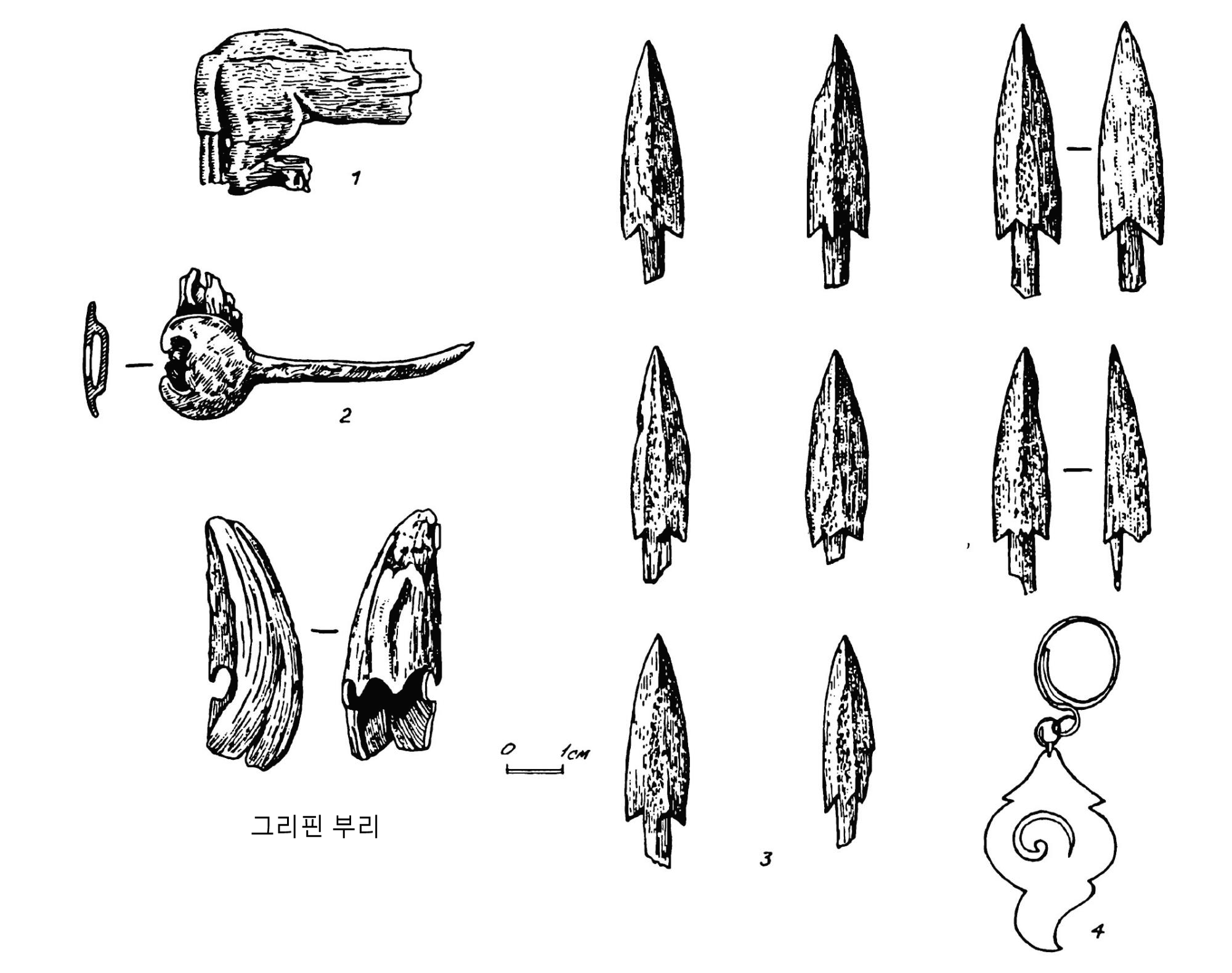 아크 알라하 1유적의 1호분에는 말이 9마리나 들어가 있고, 그 말을 장식하던 굴레가 7벌 확인되었다. 굴레를 장식하던 주요 동물문양장식이 그리핀이었기 때문에 그리핀은 쉽게 찾아 볼 수 있었다.
