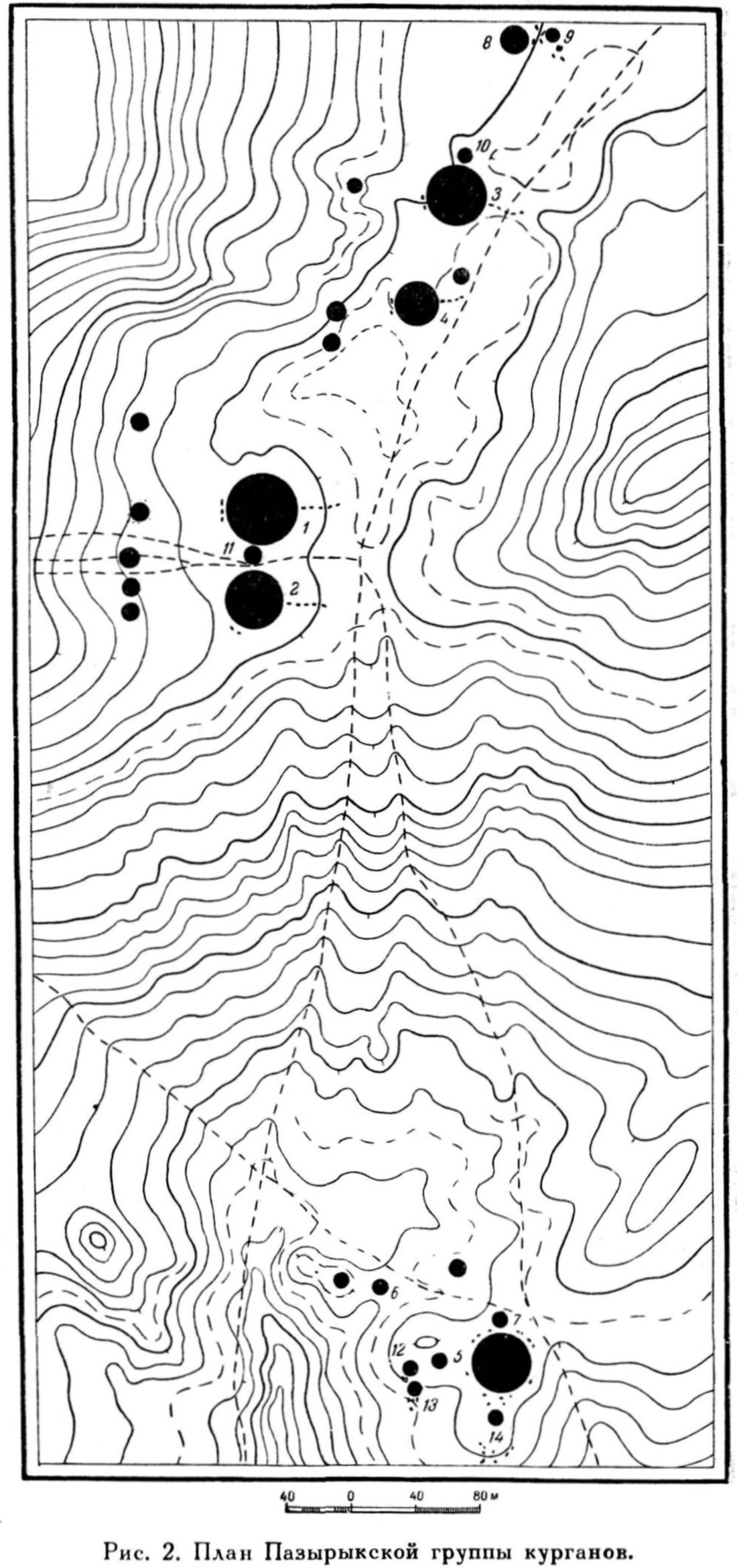 이 계곡의 고분은 모두 40여기 정도 존재하는데, 그 중에서 대형 고분 5기에는 1~5호의 번호를 붙였다. 북쪽의 2기는 3호와 4호, 가장 남쪽에는 5호, 중앙에는 1호와 2호가 위치한다. 그 외에 번호가 붙은 것은 9기로 6~14호까지 번호 있는 무덤이 있다. 번호를 매기지 않은 고분은 외형은 고분이지만 제일 상층에 돌이 돌아가는 것 외에 그 아래에는 아무것도 없다는 사실을 이미 1924년에 알려졌기 때문에 더 이상 파지 않았다. 이 외에도 알타이 산맥에는 봉분(표토층 위로 올라온 무덤상부구조)는 있으나 그 아래에는 아무것도 없는 경우가 상당히 많다.