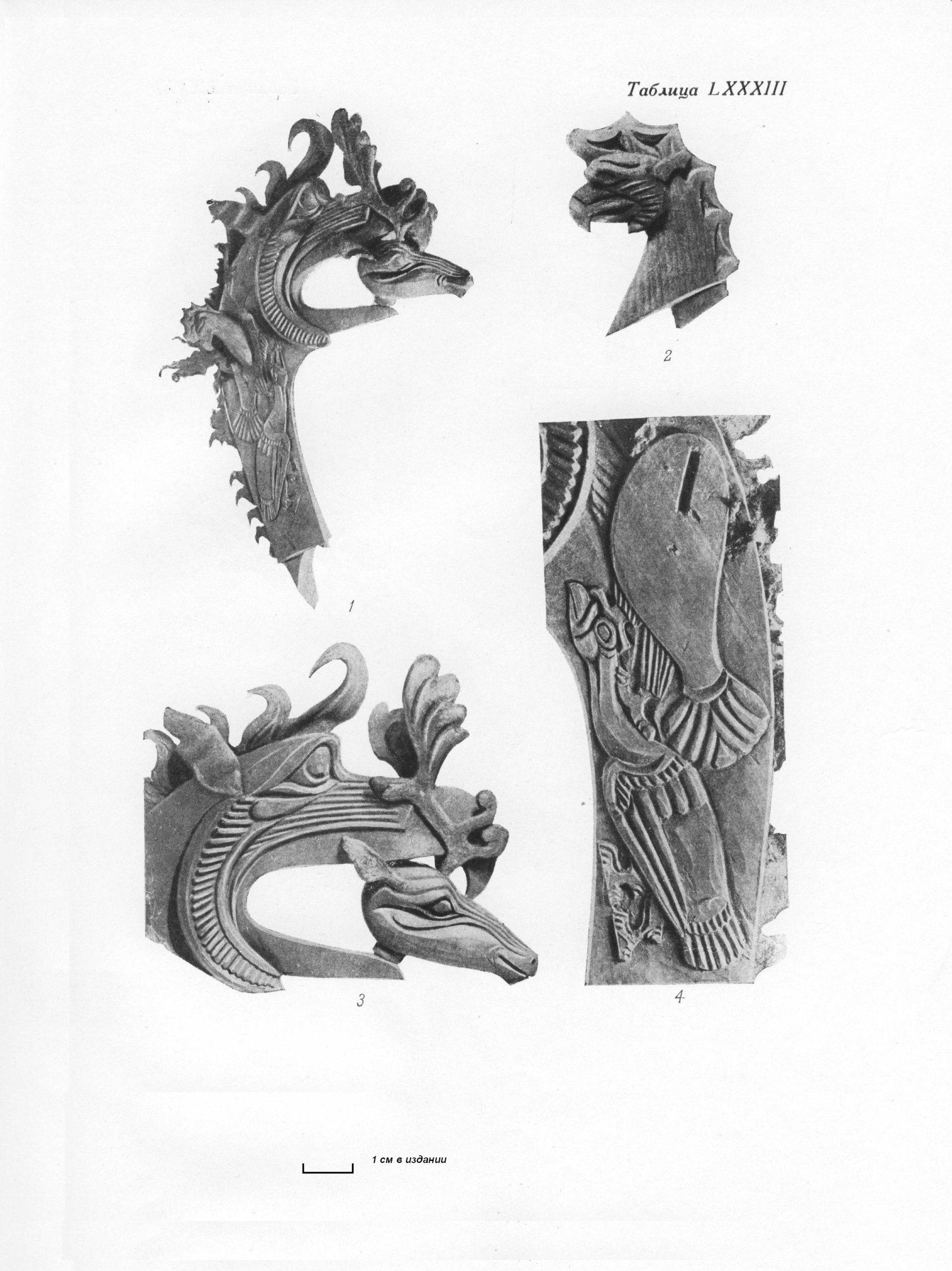 나무로 제작된 그리핀의 입속에 뿔 달린 사슴머리(그림 1-1, 2-3)를 표현 한 것이다. 남아 있는 이 나무조각의 높이는 34.5cm, 너비가 15cm가량이다. 그리핀의 목에도 작은 그리핀의 머리가 양쪽으로 한 쌍(그림 2-2)붙어 있는데, 큰 그리핀의 몸통에 삽입 가능한 사각형 구멍이 있다. 이 그리핀의 몸은 큰 그리핀의 몸통에 조각되어 있는데, 그 아래에는 거위가 한 마리씩 조각되어 있다(그림 2-4). 그리핀 본체의 눈과 부리 사이에는 부채꼴 모양으로 수염?을 표현하고 있고, 정수리부터 목에는 가죽으로 갈귀를 표현하고 있다(그림 1-1, 그림 2-1).