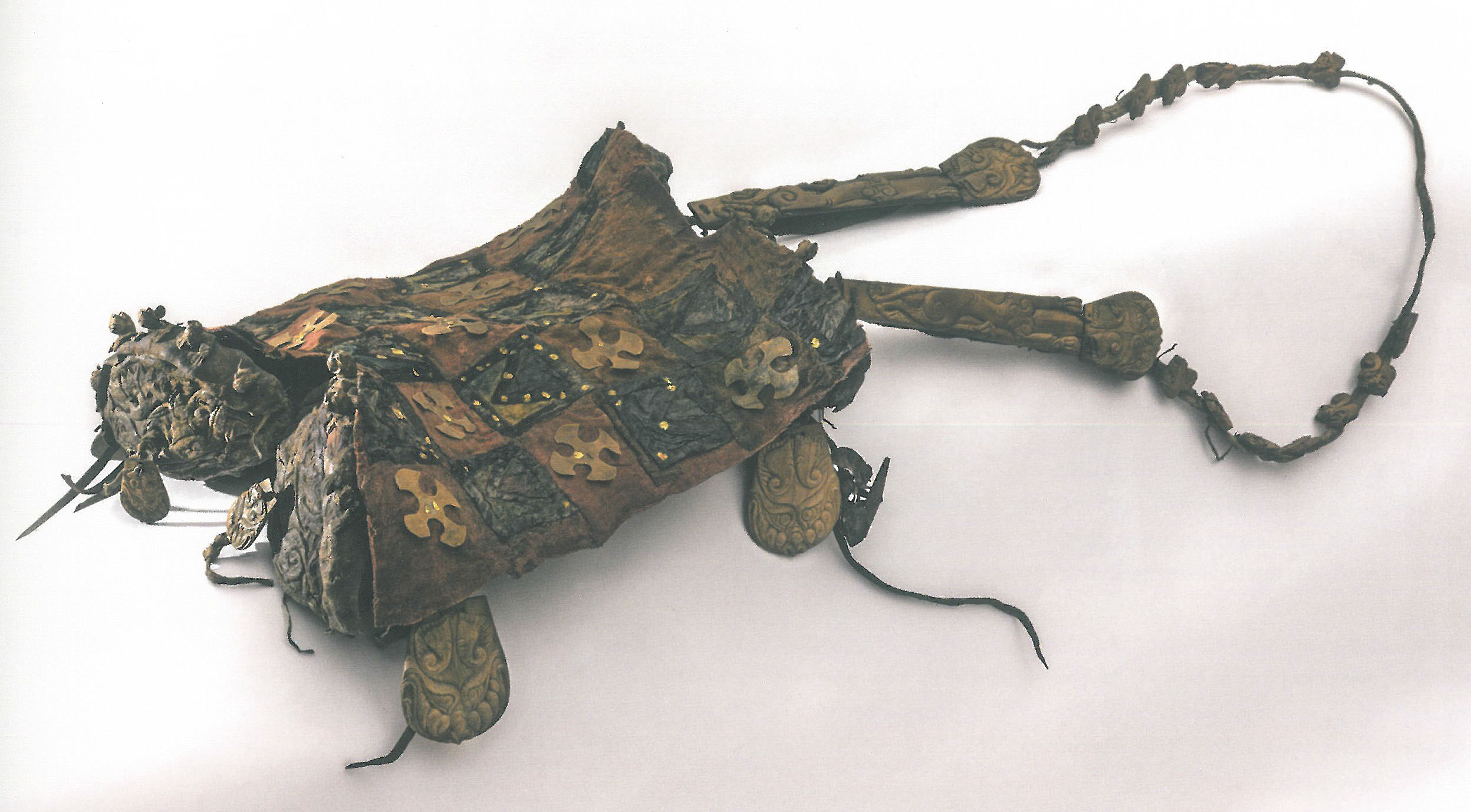 동물문양장식이 있는 1개체 분 중 하나는 이미 소개해 드린 바 있는데, 재갈멈치와 굴레를 연결하는 부위인 Y자형에는 늑대머리가 장식되어 있고, 재갈머리는 호랑이의 두상이다. 호랑이와 늑대는 단순하지 않고, 귀 모양이 실제와 다르다(그림 5). 이 굴레는 그림 6의 안장덮개와 세트이다(그림 6).