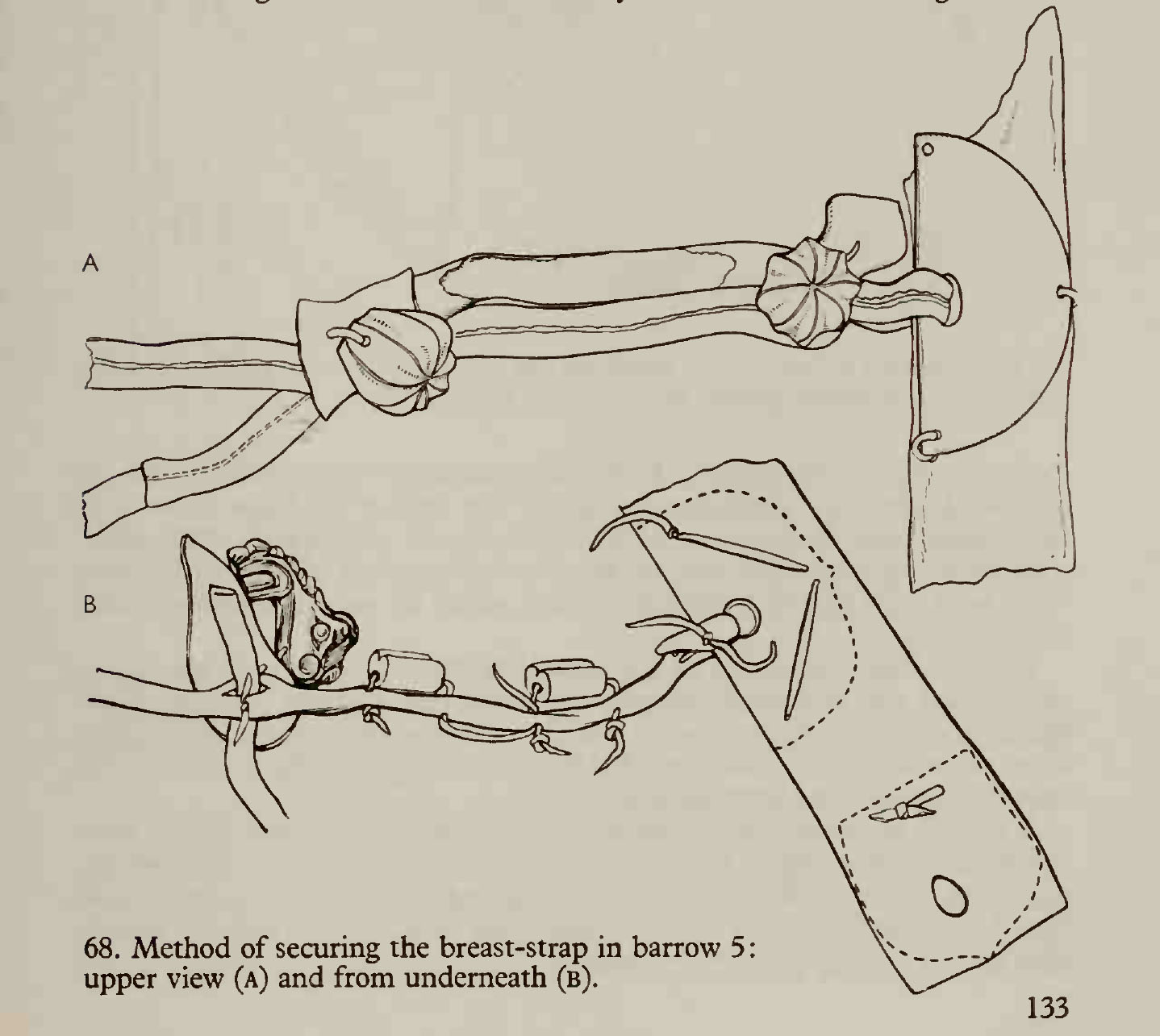 파지릭 유적의 5호분에는 말이 9마리 출토되었고 그 가운데 4마리에는 굴레, 안장이 착장되었고, 1마리는 이와 함께 말 머리장식까지 확인되었다.