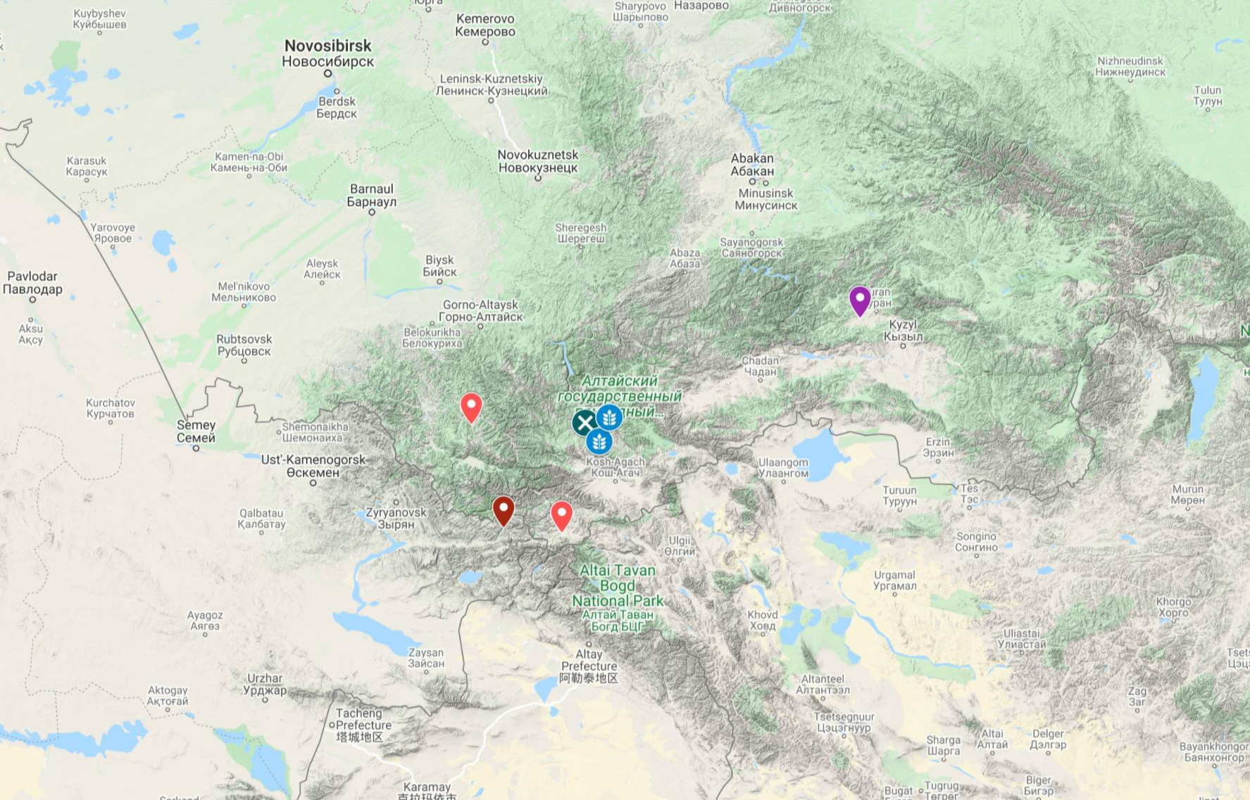 지도 1. 스키타이 문화의 유적(현재까지 언급된 유적이 다 있음. 바샤다르 유적은 지도에서 가장 왼쪽 점(주황색)이다. 지난 번에 아르잔 유적(보라색)은 지도 사진만 제공했으나, 위의 링크를 보시면 좀 더 정확한 위치를 알 수 있다. 뿐만 아니라 바샤다르 유적에서는 구글에 사진도 소개되어 있다. 구글로 여행을 떠나는 것도 나름 재밌다. 필자는 러시아 연해주의 발해성이나 여진 성을 구글 지도로 찾아본다...요즘은 시간이 없지만.....