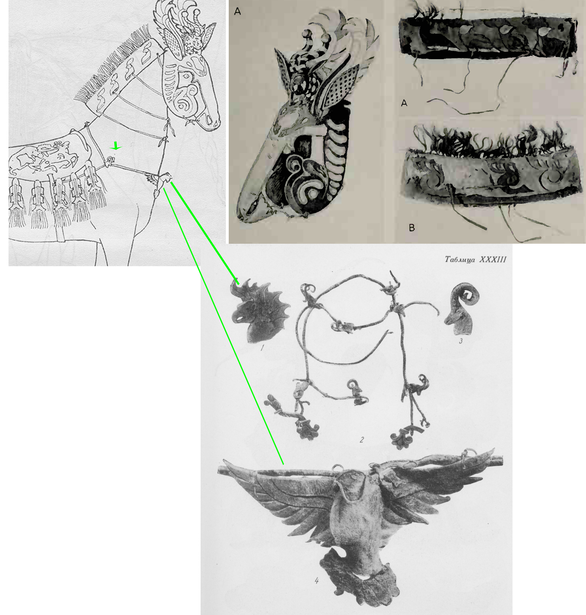 파지릭 1호에서 출토된 5번 말은 그리핀의 날개를 귀 사이에 붙이고 그리핀과 호랑이가 싸우고 있는 모습을 표현했다고 하는데, 잘 이해는 되지 않는다. 하지만 말의 목에는 가죽과 펠트로 만들어진 갈기가 표현되어 있다. 이 갈기에는 가죽 아플리케 장식이 붙어 있는데, 그리핀 4마리이다(그림 1).