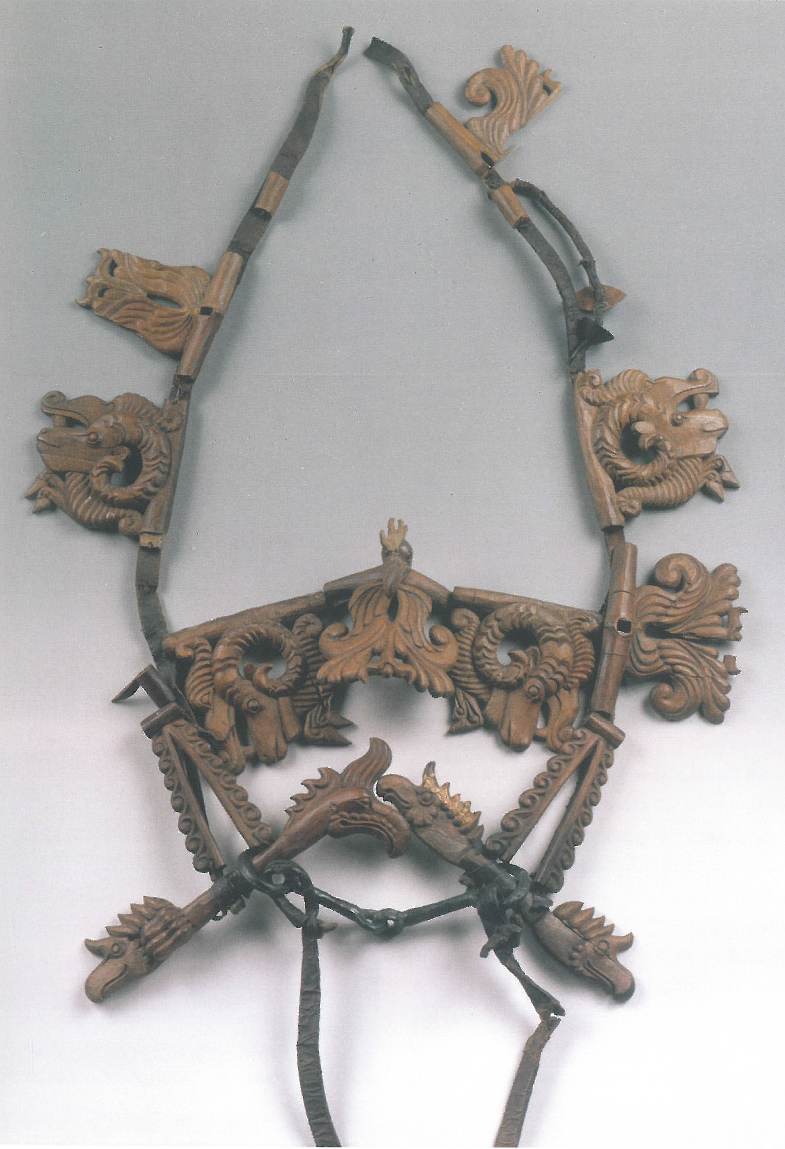 말의 마스크 안에는 굴레장식이 드러난다. 말 안장에 연결된 염소와 같은 모양의 장식이 연결부위마다 붙어 있는데, 6섯마리이다. 재갈멈치의 끝은 팔메트 문양이라고 부르는 일종의 넝쿨 식물이 표현되어 있다(그림 1).