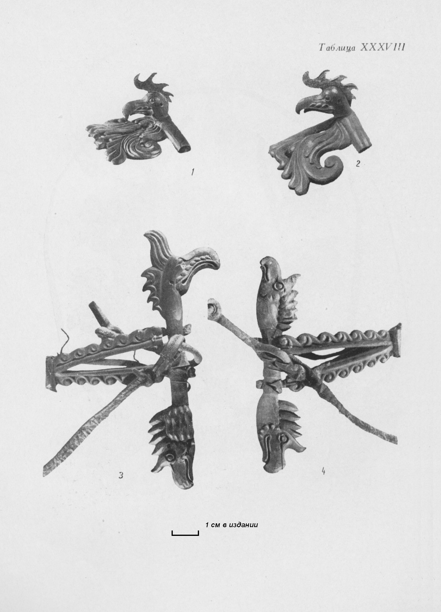 그림 4. 파지릭 1호에서 출토된 8번 말의 장식 중 일부, 3,4는 그림 3의 재갈멈치
