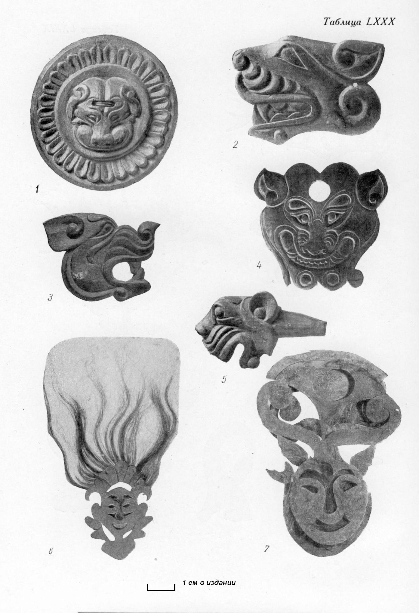 파지릭 1호에서는 같은 유적의 다른 무덤에서는 확인되지 않는 말의 굴레장식이 있다. 이미 소개한 바 있는 사람얼굴모양의 장식이 달린 것이다. 장식은 5개 달렸지만, 4인의 얼굴이다. 눈, 입, 코, 광대뼈모양이 다른 4명이 나무에 조각되었다. 아마도 1호무덤 주인공과 관련이 있을 듯 싶다(파지릭 1호에 제일 첫 번째 포스팅에서 찾아보시면 된다).