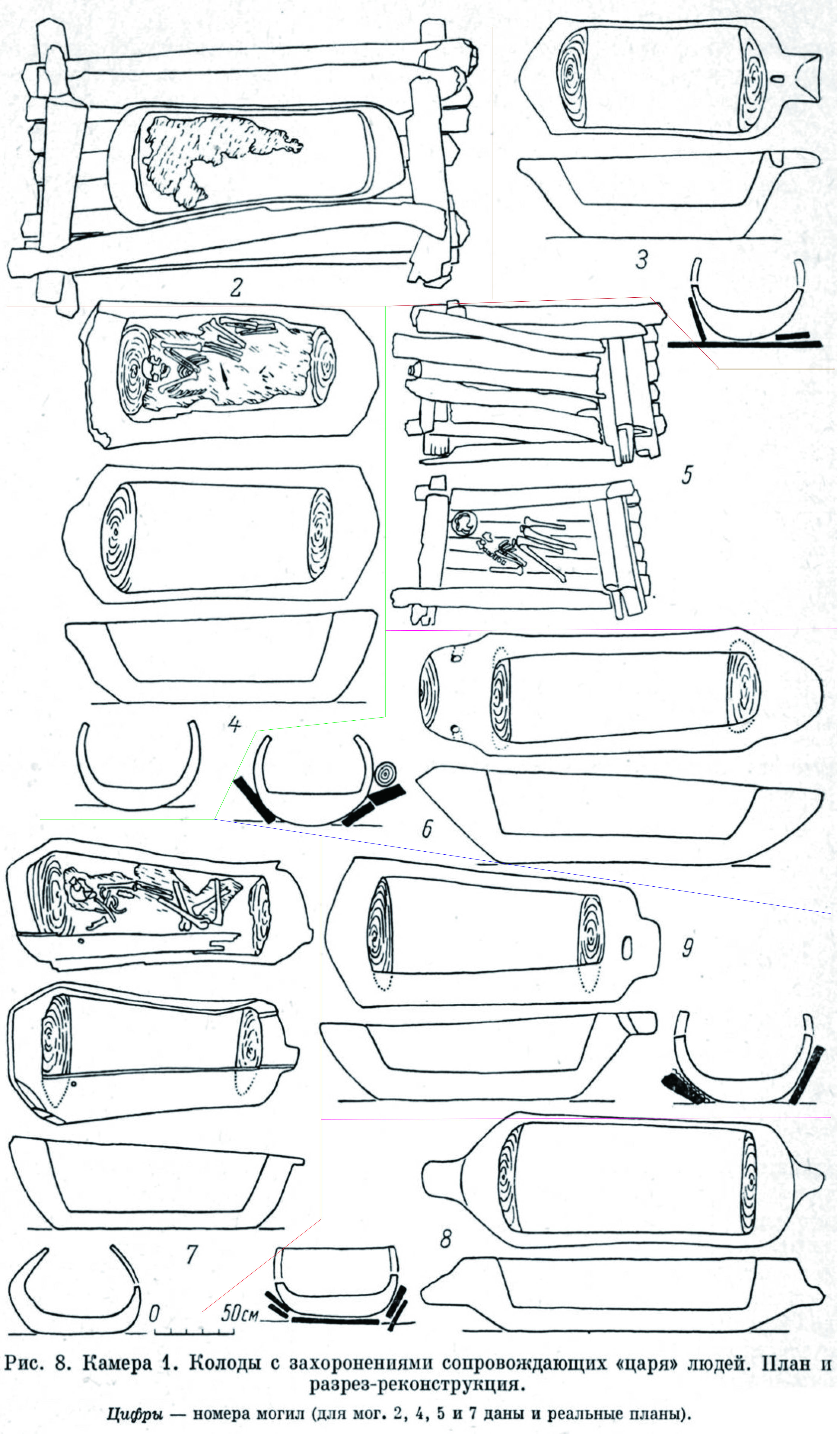 그림 3. 아르잔-1호의 중심 매장부에서 확인된 통나무관, 그림 2의 번호와 일치(필자편집)