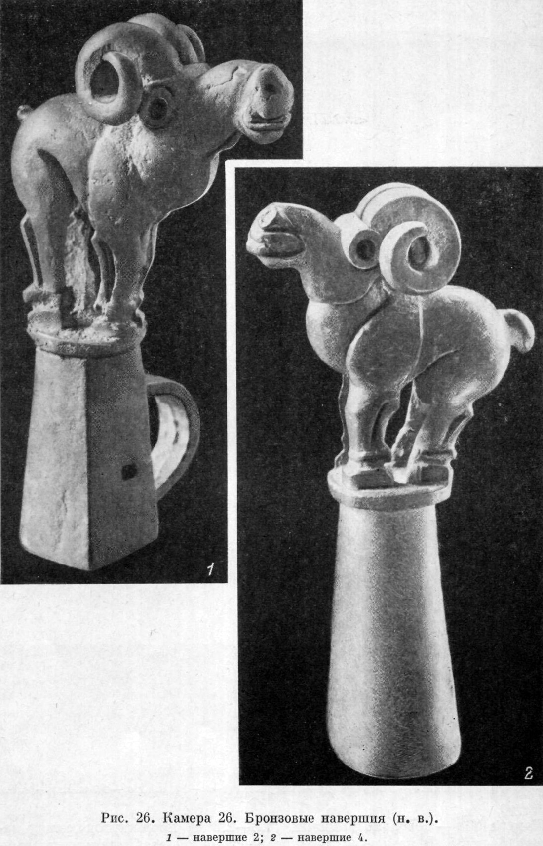 이 유적에서는 동물문양장식에서 아직 형상화 된 그리핀이 나오지는 않는다. 하지만 파지릭 고원과 우코크 고원의 유적에서는 발견되지 않는 산양장식이 출토된다(그림3,4). 말무덤인 26a, 26b 무덤방에서 출토되었다. 이 무덤방에서는 최소한 말 뼈 11마리분이 확인되었고 재갈과 재갈멈치 세트도 11벌 출토되었다. 굴레에 달던 각종 장식판들도 있다. 특히 멧돼지 송곳니로 제작된 장식판이 많이 출토되었다.