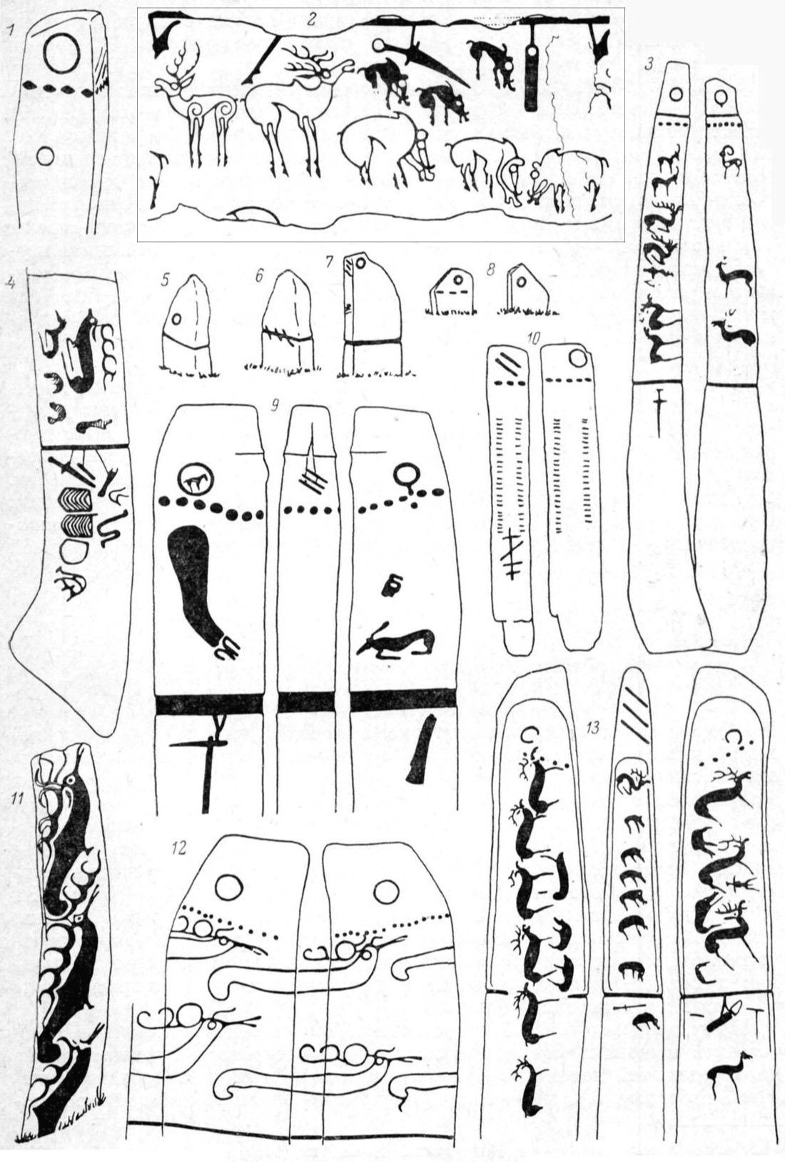 그림 2. 아르잔 및 그 주변에서 발견된 사슴돌.1-소스노프카 발견(아르잔과 가까운 곳)2- 아르잔1의 봉분 출토(사각형 돌을 펴서 그린 그림), 3, 10-오르삭-악시 출토, 4-투란(아르잔 무덤에서 우측에 위치한 마을이름) 발견 사슴돌, 5,6,8-아르잔과 가까운 벨로예 호수 출토, 7-우육고원 발견, 9-사말가타이, 11-볼쇼이 아직, 12-친가타그, 13-우육-아르잔 출토