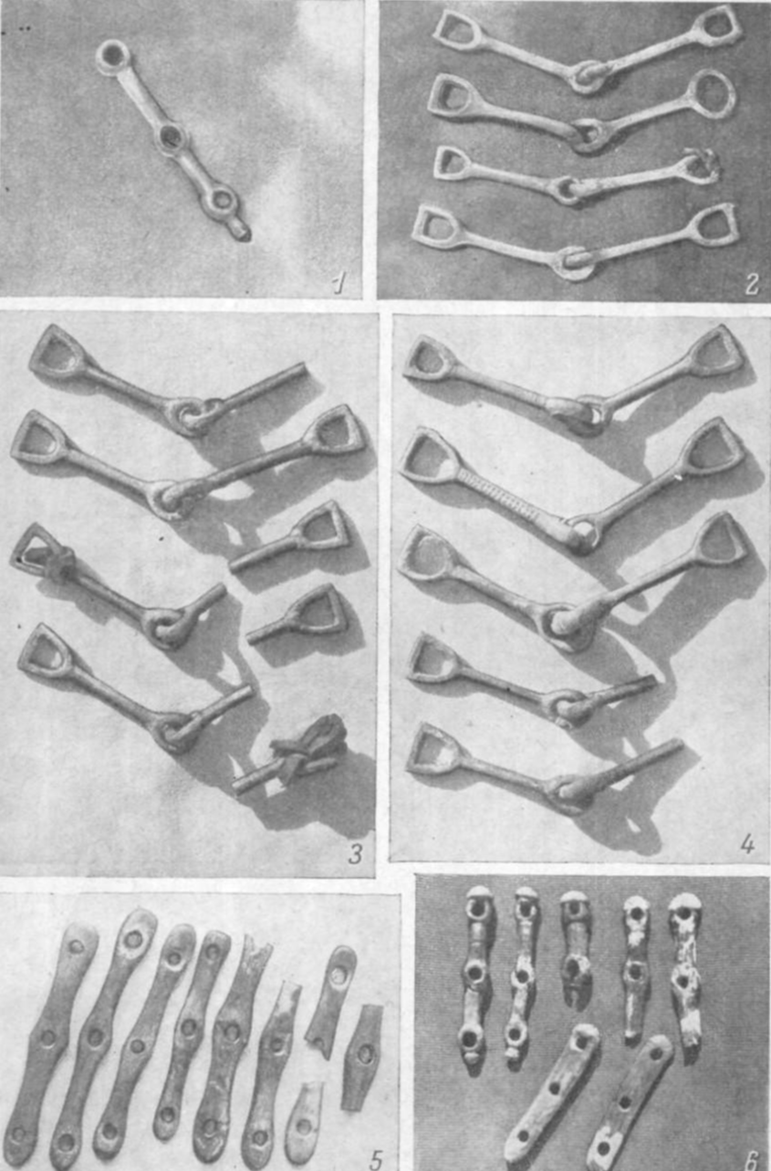 그림 1. 아르잔-1호 출토 재갈멈치(1, 2-34a번 무덤방 출토, 3-5: 37번 무덤방, 6-5번 무덤방 출토)(5,6-뼈, 그 외 청동)