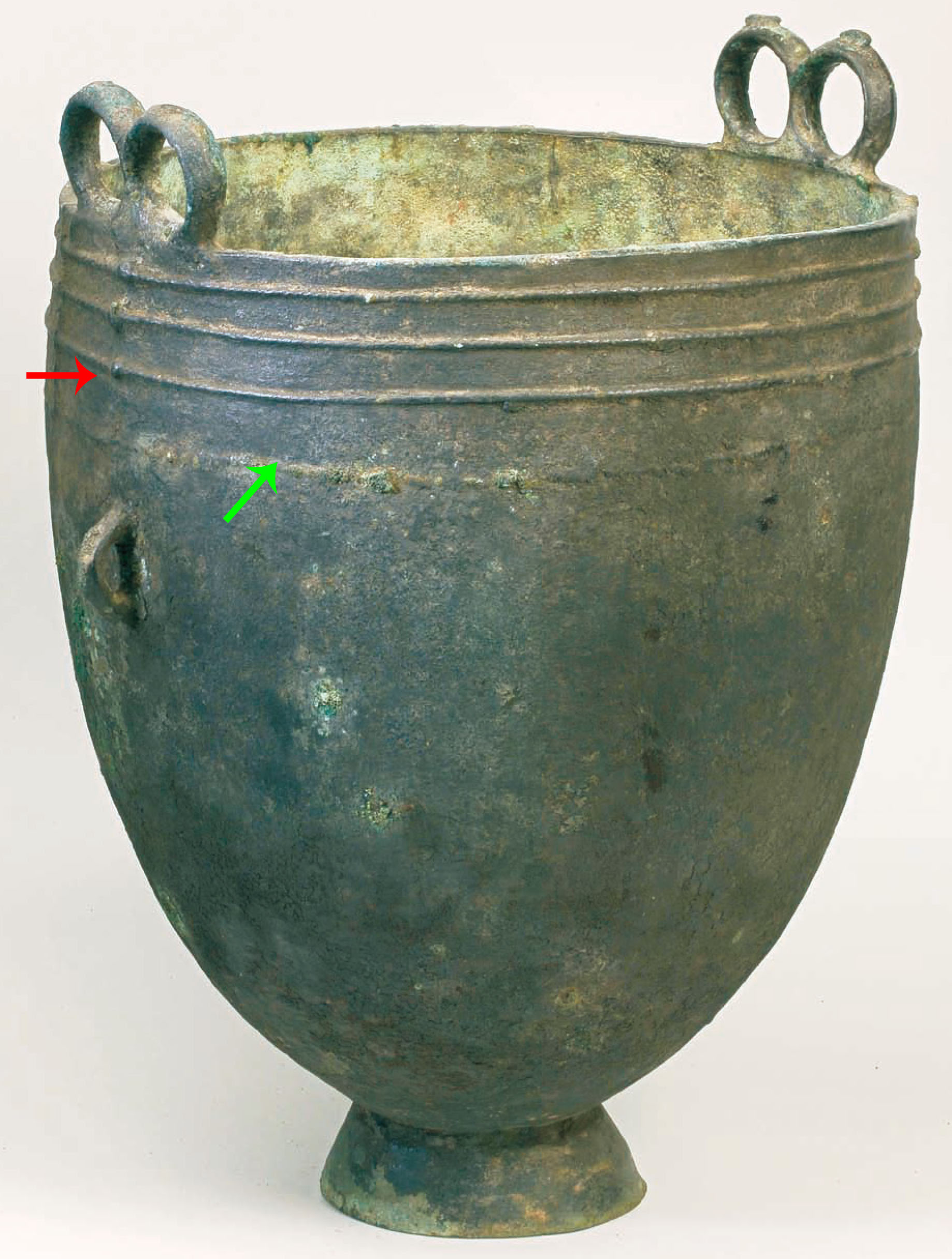 그림 4의 유물을 보면 입구부위에 불룩 튀어 나온 3개의 줄이 돌아가는데, 손잡이 아래 부분을 보면 솥을 거푸집에 넣고 제작한 흔적이 남아 있다. 3개의 줄 아래에도 매끄럽지 않은 부분(녹색 화살)이 길게 튀어나와 있다. 이 부분은 이 선을 경계로 위와 아래가 따로 제작되어서 붙인 흔적이다. 땜질한 흔적이다. 이 솥에는 이외에도 수리한 흔적이 남아 있다고 한다.