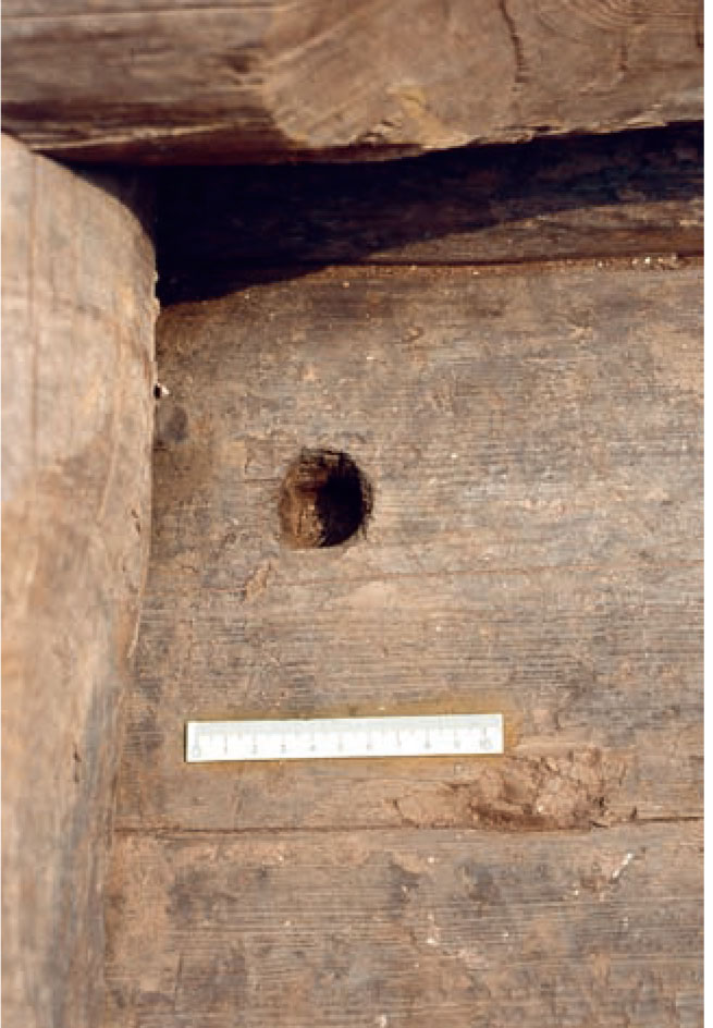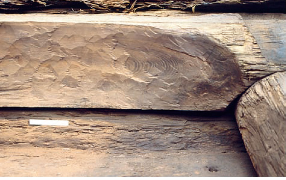 그림 3. 아르잔 –2호 무덤방 5호의 2차 통나무의 가장 아래면. 모서리에서부터 끌과 같은 것으로 다듬어서 잘라냈다.