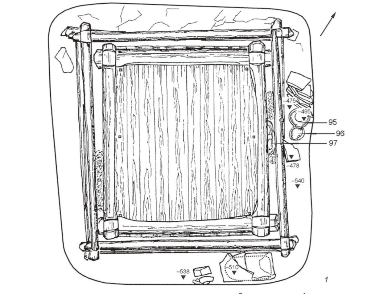 내부의 2차 무덤방 바닥에는 12개의 통나무를 사용했는데, 가장자리는 큰 통나무를 이용했고 안쪽의 10개는 상대적으로 직경이 작은 통나무를 이용했다. 2차 무덤방의 벽은 바닥통나무를 제외하고 4개의 통나무를 쌓아 올렸다. 쌓아 올린 통나무를 해체하고 유물을 수습하고 난 가장 바닥모습이 그림 1이다.