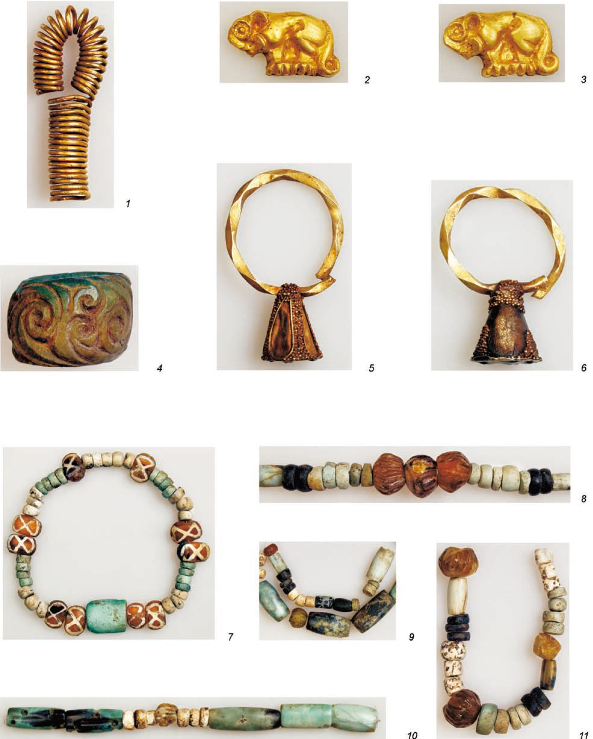 그림 2. 아르잔-2호 무덤방 11호(1)출토품과 무덤방 13A, 2호 인골출토품(2-11)